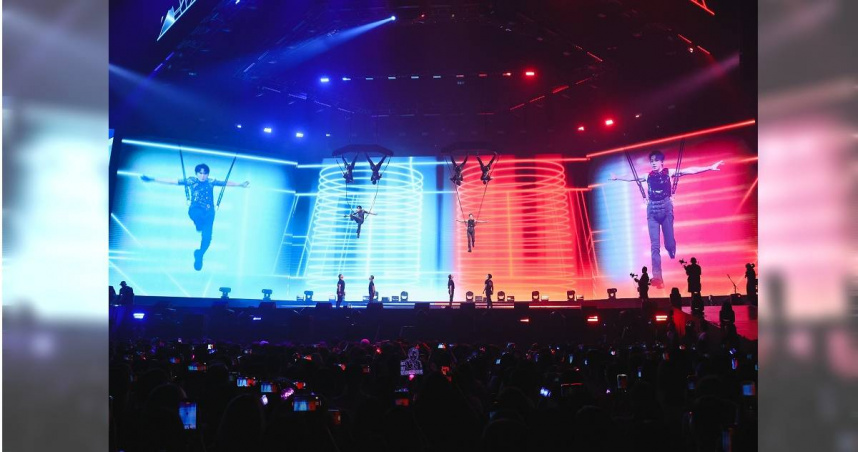 [周刊王CTWANT] Energy一連兩天在高雄巨蛋展開《ALL IN全面進擊》演唱會,首場演出昨(7日)登場,牛奶、坤達在10米高空展現高空彈簧特技,完成空中倒立與風火輪旋轉,過去以「頭轉」聞名的牛奶,這次僅靠兩條彈力繩與全身力量,在空中連續完成風火輪翻轉整整10圈,連在後台準備的團員們都驚呼:「轉得比在彩排多圈!」坤達則在空中強力拉肌,展現爆繃二頭肌,並在兩位夥伴的支撐下挑戰高難度的空中倒立,兩人超搏命演出,更笑稱這段表演叫「牛轉乾坤」,把高雄巨蛋氣氛推到最高點。