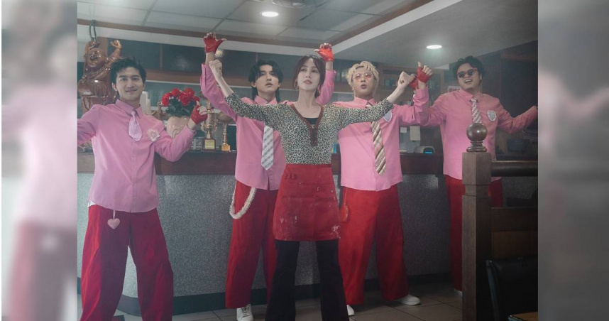 冰球樂團新歌MV邀來小薰飾演老闆娘,一同高舉大拇指同台尬舞。(圖/何樂音樂提供)