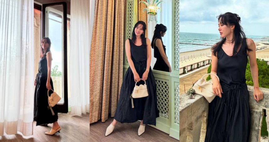 只見她穿上極簡黑色背心搭配同色系長裙,低調又高級,女神氣場直接拉滿!腳上的米色尖頭穆勒鞋+同色系手提包,一秒解鎖簡單、耐看、超有氣質的時髦功力,根本行走穿搭教科書!
