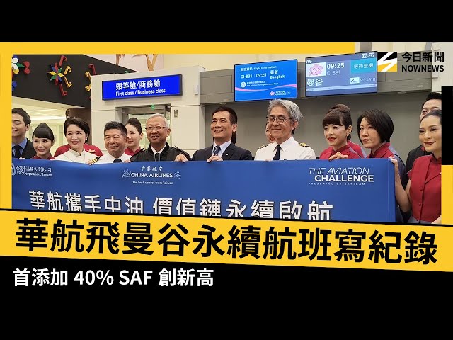 [NOWnews今日新聞] 華航4度響應天合聯盟飛行挑戰,以A350-900 新世代節油航機執飛CI831 / CI832 桃園往返曼谷航班實踐永續作為。今年以「影響力IMPACT」為核心,強調把永續理念落實到實際行動,華航首度於台灣出發航段添加高達 40% SAF燃油,攜手台灣中油公司推動在地 SAF 實際應用,並導入低碳蔬食與空地減碳措施,引領台灣航空業邁向永續新世紀。