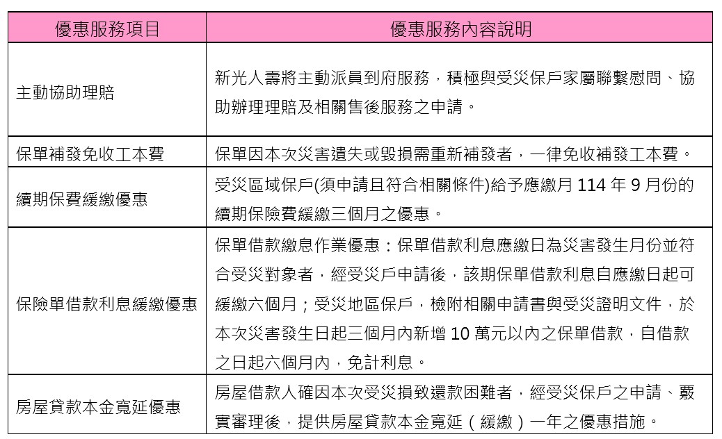 此外,同步提供「續期保費緩繳三個月」、「保單借款利息緩繳六個月」、「補發保單工本費優惠」及「緩繳房屋貸款本金及利息一年」三大服務,期望與災民共度難關。