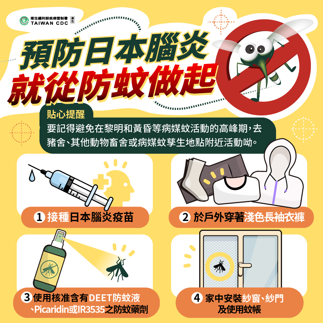 廖局長再次提醒民眾,預防日本腦炎最有效的方法為接種日本腦炎疫苗,我國幼兒常規接種時程為出生滿15個月接種第1劑,間隔12個月接種第2劑,目前仍有少數即將就讀小學的幼兒未完成日本腦炎及其他常規疫苗接種,呼籲家長主動檢視幼童的預防接種紀錄(兒童健康手冊),如有缺漏劑次,請儘速帶家中寶貝至各地衛生所或合約院所將疫苗補齊,以避免因感染傳染病衍生嚴重後遺症。