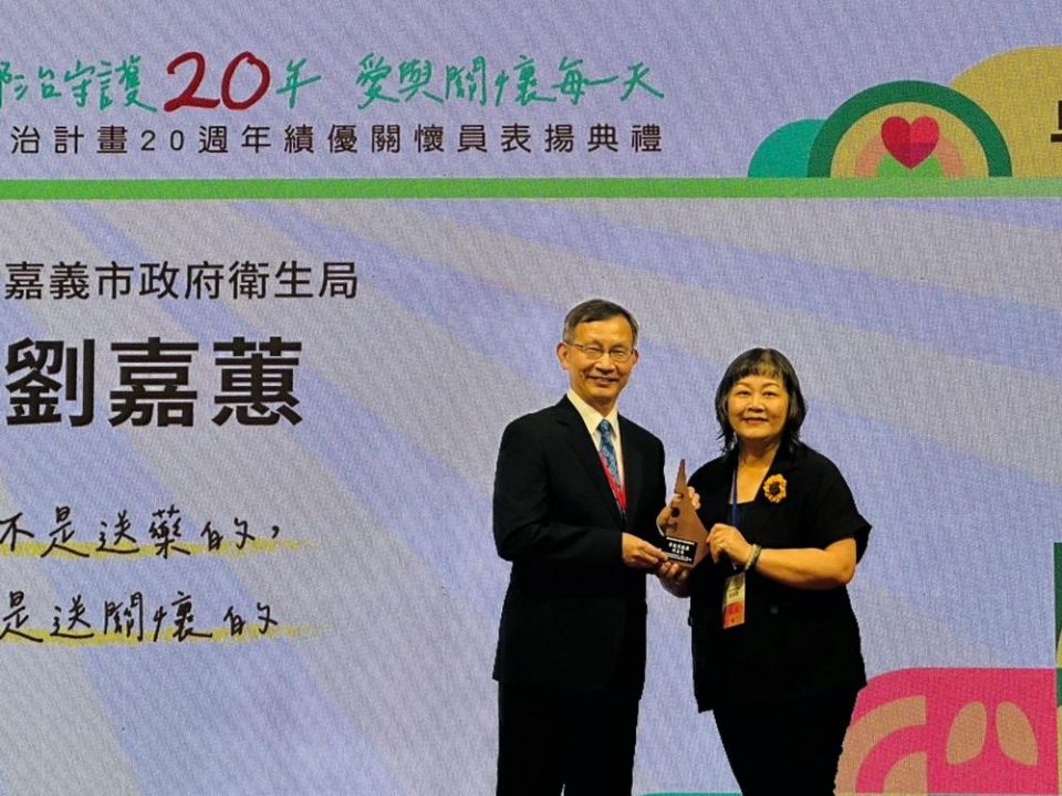 嘉義市政府衛生局資深關懷員劉嘉蕙榮獲衛生福利部疾病管制署頒發「卓越貢獻獎」。(圖/記者黃音文翻攝)