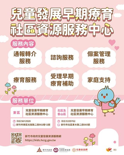 社會處呼籲,少子女化的趨勢下,兒童發展更需要被重視。「兒童發展早期療育社區資源服務中心」除了積極與在地社區合作,也持續推動全方位支持性服務,希望透過整合性資源,讓更多新竹市的兒童與家庭受惠,為孩子的未來發展奠定堅實基礎。有服務需求的民眾,歡迎直接聯繫各服務單位:東區中心:03-5612920、北區及香山區中心:03-5339762。
