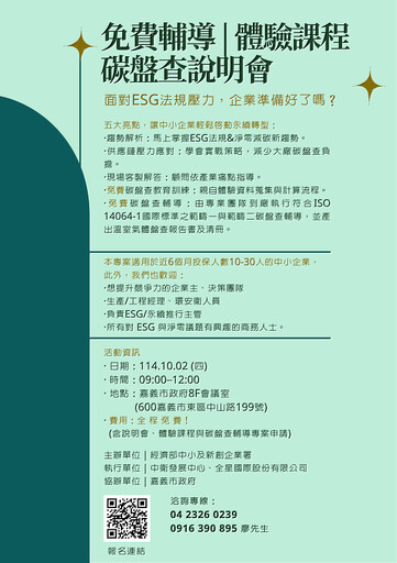 嘉義市政府為落實淨零治理、深化產業減碳動能,偕同中華民國都市計劃學會、國立成功大學都市計劃學系、全星國際股份有限公司、法國標準協會貝爾國際驗證股份有限公司,產學研共同依照嘉義市特色產業,持續提供一站式碳諮詢服務,協助在地製造業與商業服務業建置盤查體系、培育內部人才、銜接供應鏈與法規要求。經濟部中小及新創企業署也針對中小微企業主、經營團隊、內部主管等對象,於10月2日上午9時於嘉義市政府8樓會議室舉辦「碳盤查免費輔導專案說明會」,歡迎想提升競爭力的商業服務業及製造業企業,對ESG、AI應用、淨零議題有興趣的企業人士報名參與。