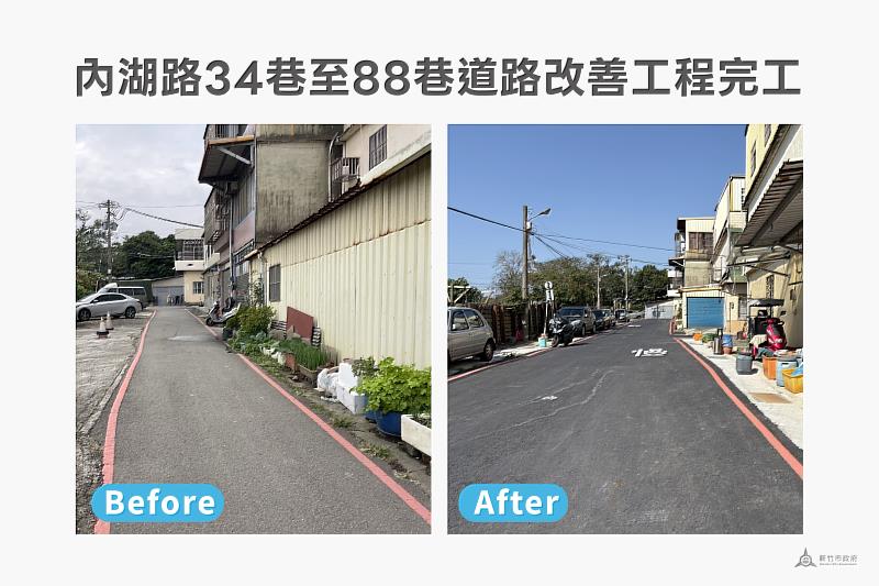 為解決新竹市香山區內湖路34巷至88巷路段長期破損不平、巷道之間無法順暢銜接等問題,新竹市政府推動道路改善工程,投入159萬元經費進行整體改善,此次工程不僅全面提升路面耐久性與排水效率,也成功打通巷道動線,讓居民往來更加順暢。改善後的道路大幅提升社區交通品質,為當地居民打造更便利、更安全的生活環境。新竹市議會市議員陳啓源於今(21)日質詢中對市府改善香山區內湖路34至88巷的積極作為表達肯定,市府感謝陳議員的肯定,也感謝陳議員對本案的長期關心與支持。