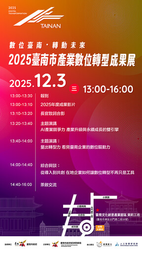 為展現臺南推動產業數位升級的具體成果,臺南市政府經濟發展局將於12月3日(週三)下午1時,在臺南文化創意產業園區茉莉工坊舉辦「114年臺南市產業數位轉型成果發表會」,以「數位臺南・轉動未來」為主題,整合產官學研能量,全面呈現3年推動歷程與企業實績,打造南臺灣最具代表性的數位轉型展示平台。