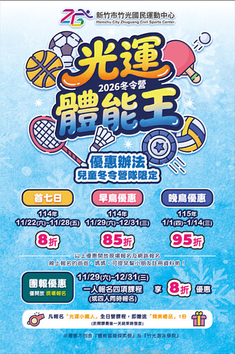 欲知更多課程及活動優惠資訊,歡迎至新竹市竹光國民運動中心官方網站或臉書查詢。