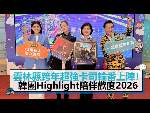睽違12年雲林再度舉辦大型跨年晚會,雲林縣長張麗善今(12)日公布重磅卡司,由韓團人氣韓團「HIGHLIGHT」擔任壓軸,記者會現場還特別獨家播放「HIGHLIGHT」錄製給粉絲們的影片。「HIGHLIGHT」今年亞洲巡迴演唱在7個城市與粉絲見面,海外巡迴首場來到台北站,今年歲末獨家在雲林演出,相約粉絲們一起跨年點亮雲林。張麗善表示,歡迎全台灣所有鄉親一起來送走2025年,迎接新的2026年到來。
