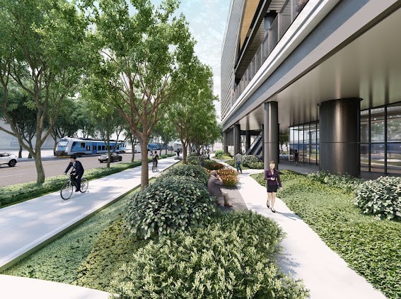 都發局長吳文彥進一步說明,特貿三南基地北案兼顧產業創新、科技交流與健康生活,特別於C棟規劃設置466坪「5G創意交流中心」,同時設置共享空間及大型公共健身中心,預計取得黃金級智慧建築與銀級綠建築標章。全案建蔽率59.95%、綠覆率超過75.8%,並將捐贈3組公共自行車,基地臨成功二路與林森四路口規劃約181坪街角廣場,並於臨成功二路側建築退縮10米,串聯南基地南綠化人行步道與自行車道,再透過立體通廊連結北基地及南基地南,營造安全、便捷且友善的人本環境。