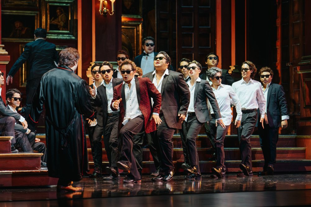 《弄臣》裡有一群存在感超強的男團,原本是公爵身邊的狐群狗黨,在宴會上高歌慶祝、把歡樂氣氛炒到最高;但轉身就成為綁架弄臣愛女的黑道兄弟,獻上獵物給「公爵老大」辣手摧花。