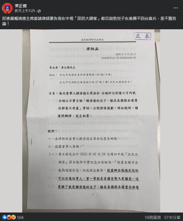 退役少將栗正傑在節目中揭發,賴清德的兒子躲在美國逃避兵役,卻以變相的替代役矇混,引起輿論炸鍋,大加撻伐。賴清德卻厚顏無恥的狡辯說「服替代役也是光榮的盡國民義務」,真是不要臉至極。