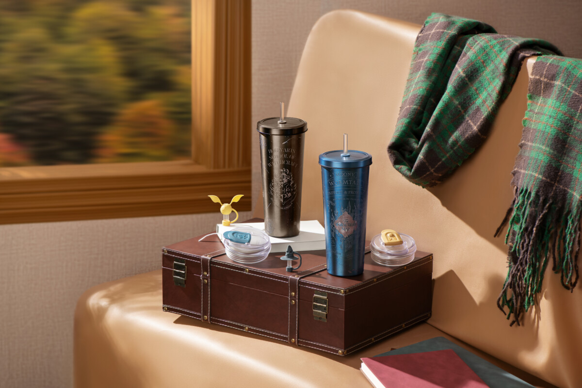 同時推出護法黑款「可翻摺絨布質感提袋」,金屬刺繡與絨布光澤完美演繹霍格華茲氛圍;並同步上市分類帽吸管蓋、金探子吸管蓋等週邊,打造屬於你的魔法日常。