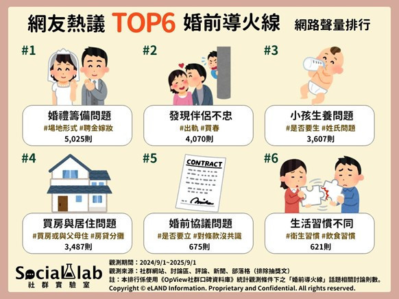 在近一年網友對於「婚前導火線」的討論中,「婚禮籌備問題」高居聲量榜首。婚禮的籌備過程繁雜,從婚紗、宴客場地到聘金,都仰賴準新人之間的溝通協調。網友討論指出,許多情侶在這些細節上的分歧,其實反映了雙方在金錢觀、生活理念等根本的價值觀落差。