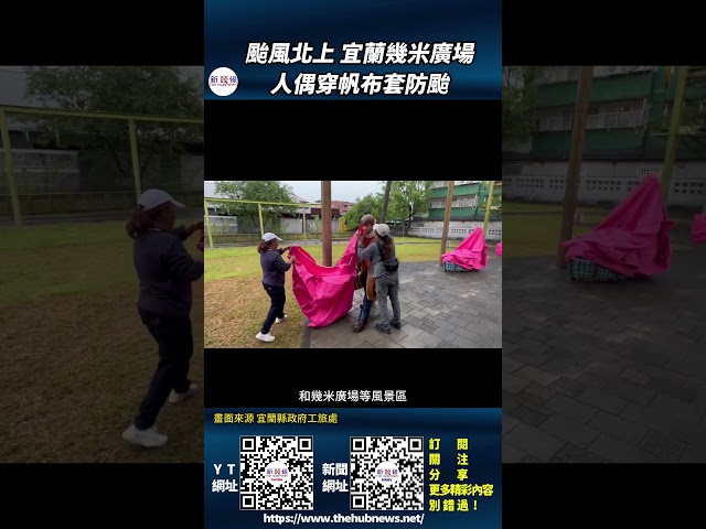 影音/颱風北上 宜蘭幾米廣場人偶穿帆布套防颱