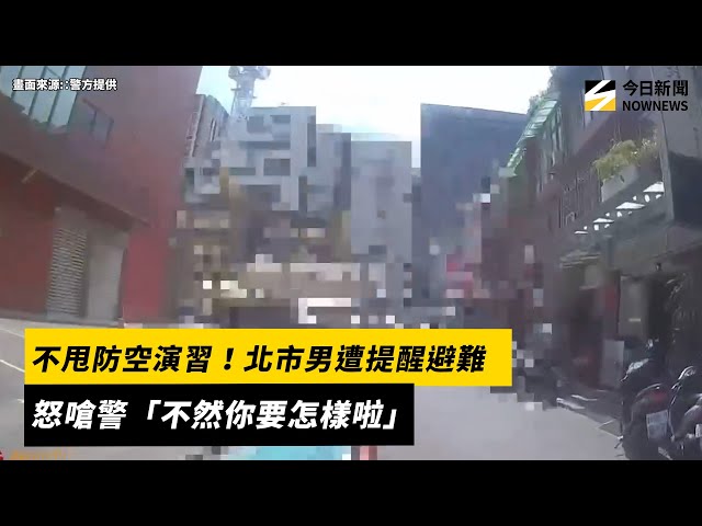[NOWnews今日新聞] 國軍漢光41號實兵演練,今(17)日下午1時30分北部地區實施2025城鎮韌性(防空)演習,台北市中山警下午1時36分在伊通街與建國北路二段6巷口,發現一名民眾於路上徘徊,警方見該情況隨即上前告誡,但民眾執意要在巷子內逗留,更嗆警「不然你要怎樣啦!」警方依違反民防法第25條辦理。