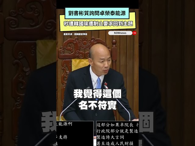 [NOWnews今日新聞] 立法院今(15)日邀請行政院長卓榮泰與相關部會,提出「打擊2.0執行成效」專案報告並備質詢,民眾黨立委劉書彬提到政府的再生能源政策,要藉此嘲諷民進黨是最大詐騙集團,但立刻遭主席台上的立法院長韓國瑜制止,認為今天的主題是打詐,若要問能源問題,應另外再邀請卓揆到場,與劉書彬互相爭執,場面一度尷尬。