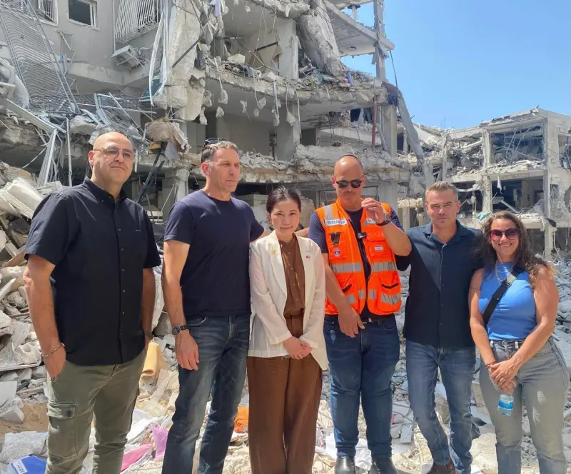 駐以色列代表李雅萍(左3)參訪遭空襲的以色列境內Bat Yam地區,她接受NOWNEWS專訪透露以哈戰火下,如何維持外交工作。(圖/外交部提供)