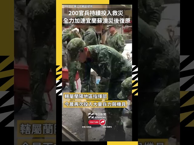 [NOWnews今日新聞] 鳳凰颱風襲台,北部地區因為東北季風產生共伴效應造成連日大雨,造成宜蘭蘇澳地區災情。國軍持續執行災後復原工作,第三作戰區今(15)日表示,轄屬蘭陽地區指揮部今晨再次投入大量兵力與機具,持續支援蘇澳鎮多處清理任務,並依地方政府需求滾動調整作業範圍。