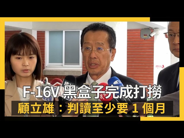 [NOWnews今日新聞] 空軍第五聯隊編號6700、由辛柏毅上尉駕駛一架F-16V單座戰機,1月6日晚間6時17分於花蓮基地起飛,執行例行性訓練任務,晚間7時29分許疑似於花蓮縣豐濱鄉東面10海浬處跳傘。空軍今(17)日證實,已尋獲黑盒子,將送美國判讀。國防部長顧立雄表示,黑盒子會盡快送美做訊號還原解讀,分析完成後再送飛安會做失事原因判讀,解讀黑盒子需要花費一個月以上。