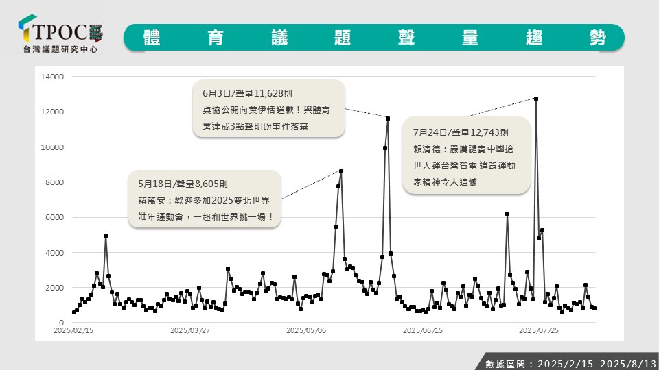 近半年體育議題的聲量曲線呈現多個高峰。首波出現在5月,雙北世壯運開幕典禮引爆關注,台北市長蔣萬安與行政院長韓國瑜在社群分享盛況,迅速掀起網友熱議。第二波熱潮發生於6月初,桌球協會取消選手參賽權的爭議延燒,最終在桌協公開道歉下,單日聲量衝上11,628則。第三波則是在7月24日,總統賴清德批評中國打壓我世大運代表團、搶走選手賀電,違背運動家精神,相關發文卻被網友「歪樓」至現金普發與大罷免等政治議題,使聲量飆至12,742則。