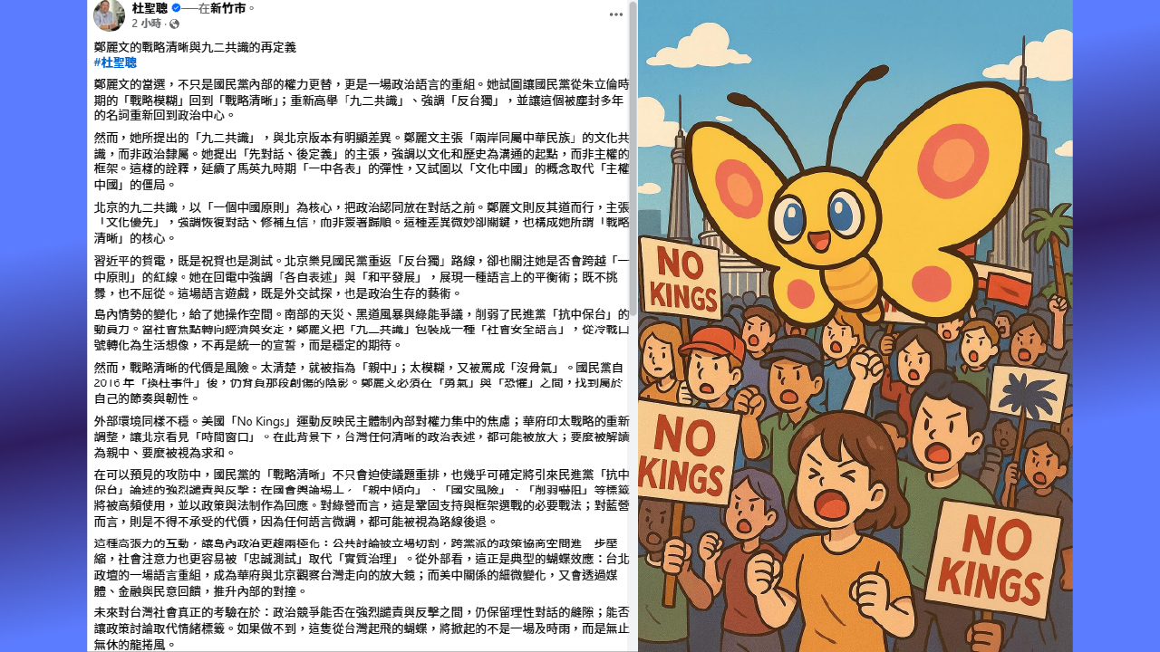 杜聖聰指出,台北政壇的語言重組已成為華府與北京觀察台灣走向的放大鏡,形成典型蝴蝶效應。他強調,台灣真正的考驗在於:政治競爭能否在強烈攻防之間保留理性對話縫隙,讓政策討論取代情緒標籤。「如果做不到,這隻從台灣起飛的蝴蝶,將掀起的不是及時雨,而是無止無休的龍捲風。」