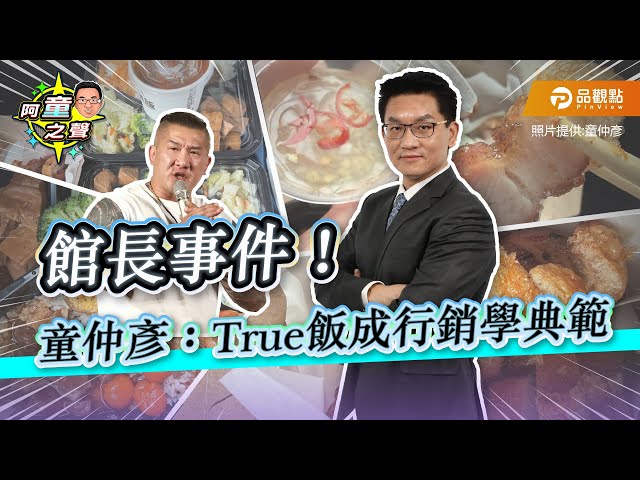 童仲彥從親身實測館長True飯便當切入。他表示,館長遭李慶元等網紅恐嚇事件看似告終,實則成就了「台灣媒體行銷學的典範」。童仲彥親自排隊購買便當,從台北開車到林口試吃,對脆皮燒肉給予高度評價,稱妻子評鑑其「可排全台北前三名」。他更揭露驚人業績數據:首日營收5萬元,隔天飆升至8萬元,足見業配威力無窮。童仲彥以此諷刺,整個事件最終只留下「暗黑的行銷、無情的工商」。