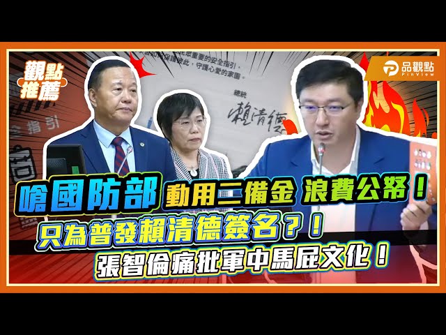 國民黨立委張智倫針對「全民國防手冊」(小橘書)的發行問題提出質疑。張智倫指出,國防部第一版印製5000份時沒有賴清德總統簽名,第二版卻動用第二預備金6450萬元印製1100萬本,並加上總統簽名,批評這是「國防部的馬屁文化」。