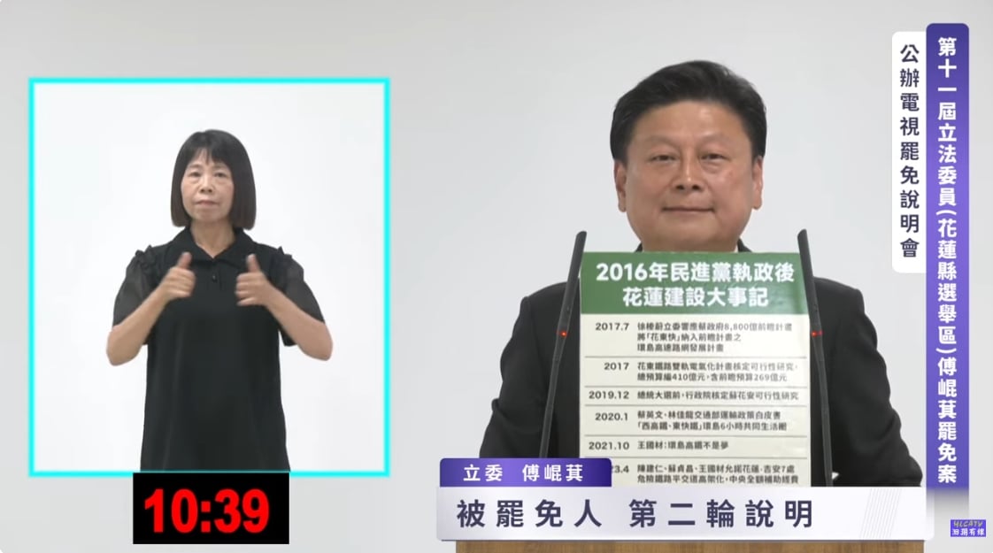 傅崐萁也是有備而來,準備了手板等資料上陣,他批評大罷免是柯建銘一手主導,就是為了把他打倒,讓一直為花東爭取權益的人,不能再發聲,傅崐萁說,「花東三法」是讓花蓮交通四通八達的關鍵,沒想到竟然成為罷免他的罪名,花蓮人爭取一條安全快捷的路,是子子孫孫的願望,而且每次選舉,民進黨也是對花蓮人承諾會給予快速的交通建設,蔡英文都可以提「西部高鐵、東部快鐵、環島6小時」的交通政見,為什麼他就不能。