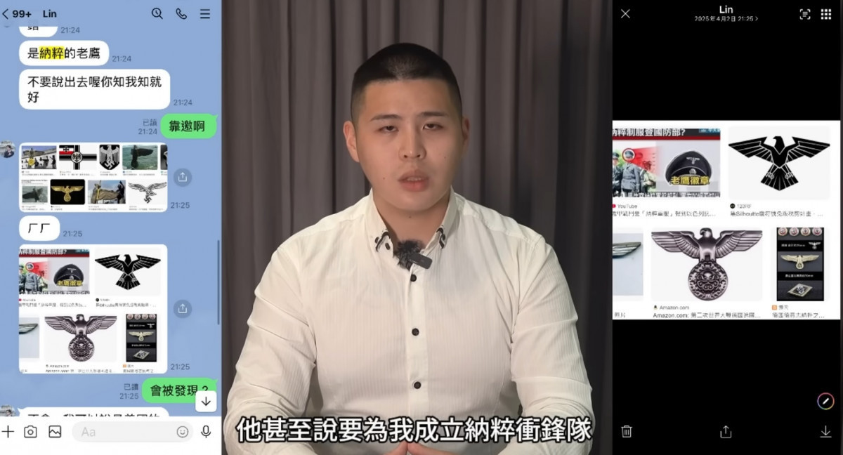 反共網紅「閩南狼」陳柏源昨天拍片宣布與網紅八炯決裂了,他秀出他跟八炯LINE對話揭露,八炯思想越來越極端,他在罷免期間研究納粹操控群眾、發明新手勢,稱419日罷免活動圖騰,發想自納粹,還揚言要在花蓮成立「納粹衝鋒隊」發起革命。對此,八炯緊急拍片道歉,坦言言論不妥,他解釋因為被藍白貼上「納粹」標籤,所以那是私下自嘲玩笑話。