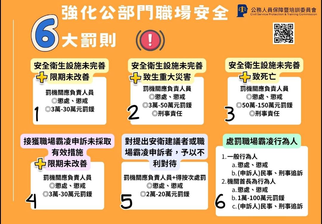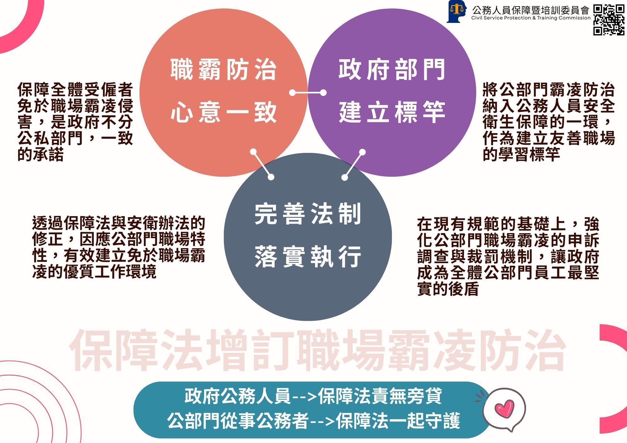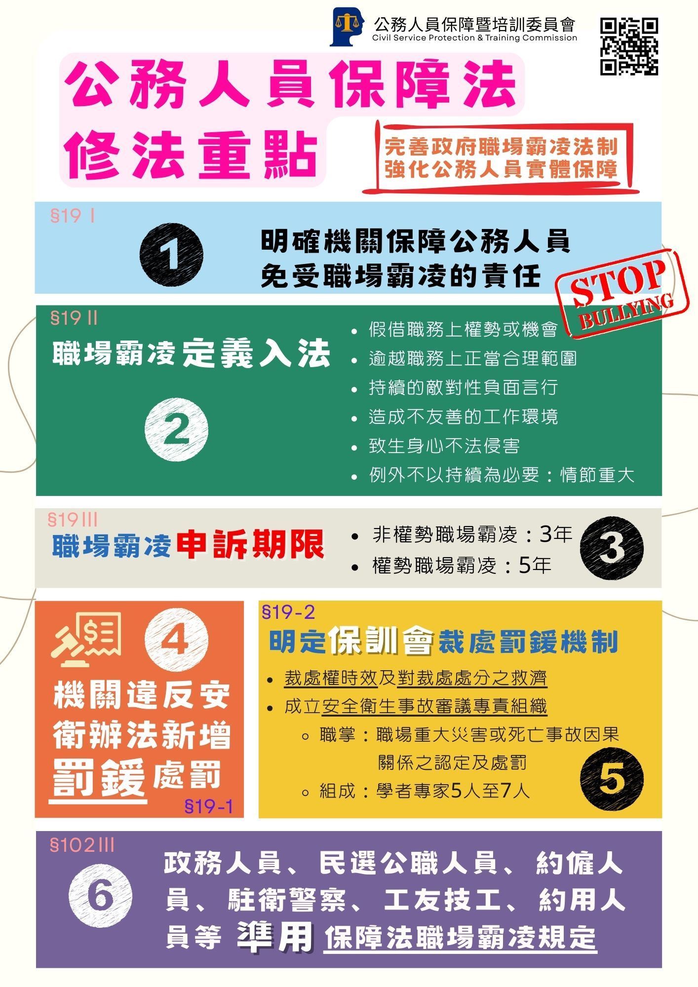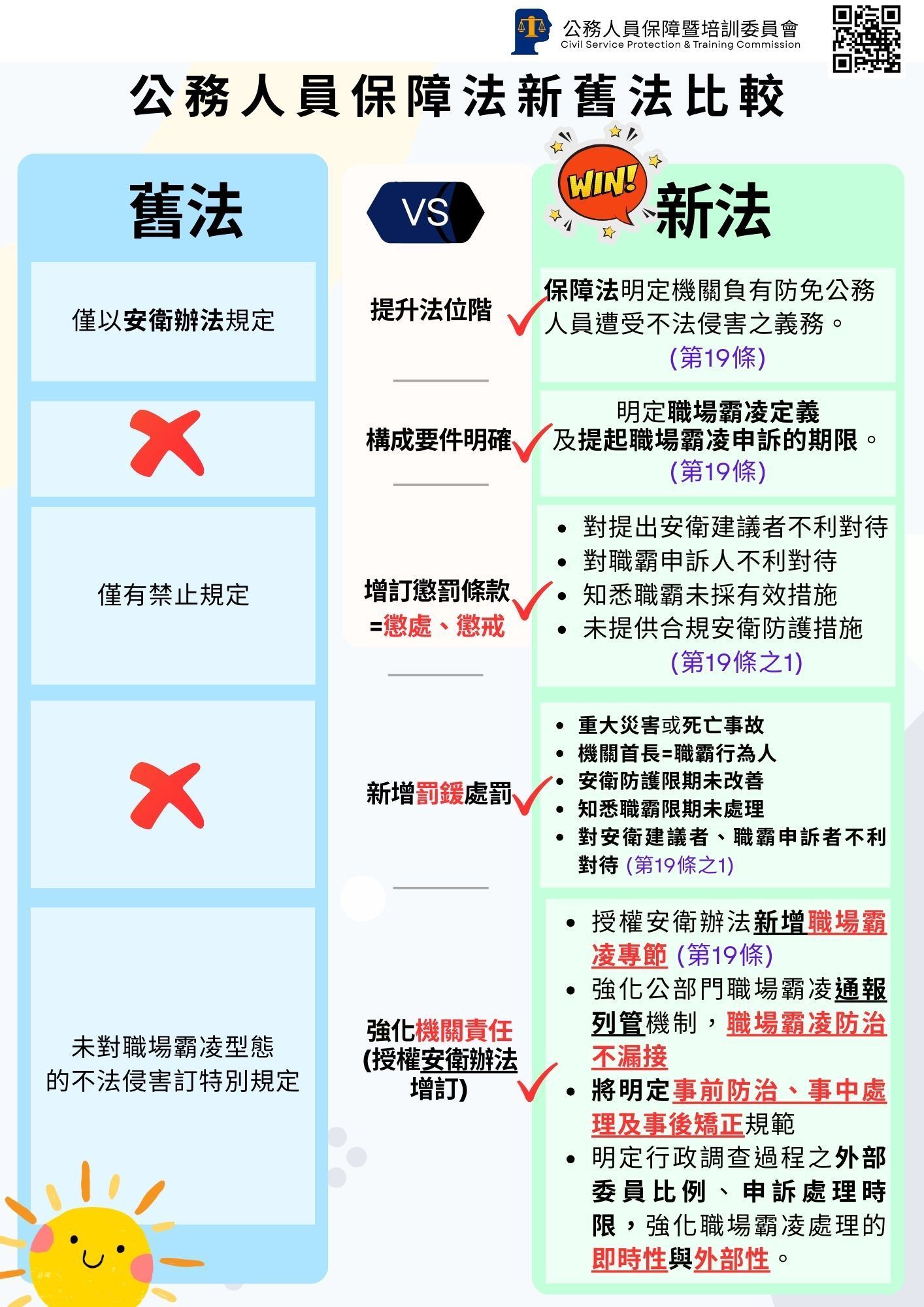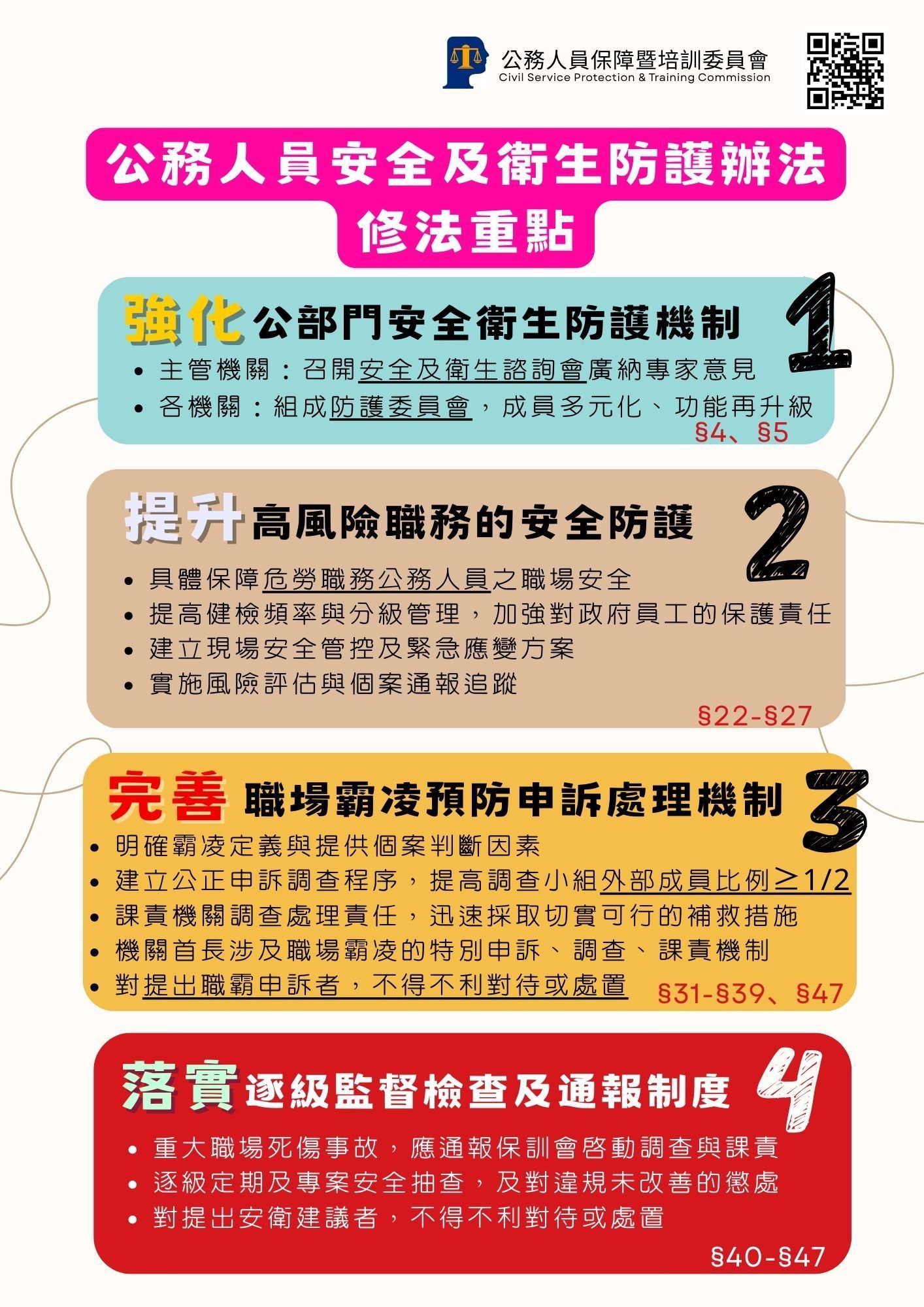 保訓會指出,藉由本次修正保障法及安衛辦法,將提供公務人員更友善之職場環境,修法重點請參見以下圖示。
