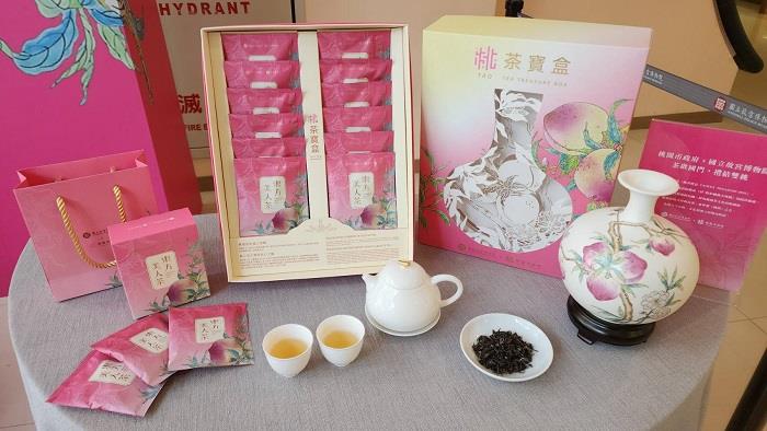 農業局長陳冠義表示,桃園茶產業發展迄今已逾百年歷史,這次透過與國立故宮博物院的跨界合作,推廣「桃茶」品牌價值,開發國際市場潛力。「桃茶寶盒」聯名禮盒以粉、白、黃漸層結合桃樹綠意,並以「茶啟國門 禮結雙桃」為理念,將象徵桃園市的「桃花」、「桃樹」,連結故宮藏品「清 粉彩蟠桃天球瓶」,由「桃」搭起桃茶與國立故宮博物院之間的橋樑,相互映照「福壽綿延」之美好寓意。其中最大亮點則為精巧的紙雕設計,透過多層次堆疊與光影穿透,呈現故宮文物與茶文化相融的靜謐意境。當燈光穿透紙雕,映照出細膩優雅的光影效果,使禮盒不僅是茶葉的承載體,更可轉化為具收藏價值的藝術燈飾。