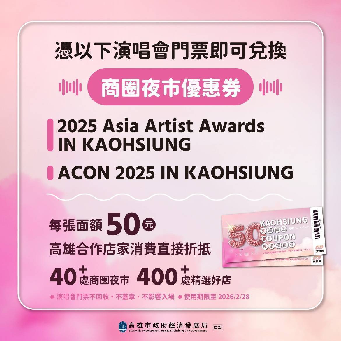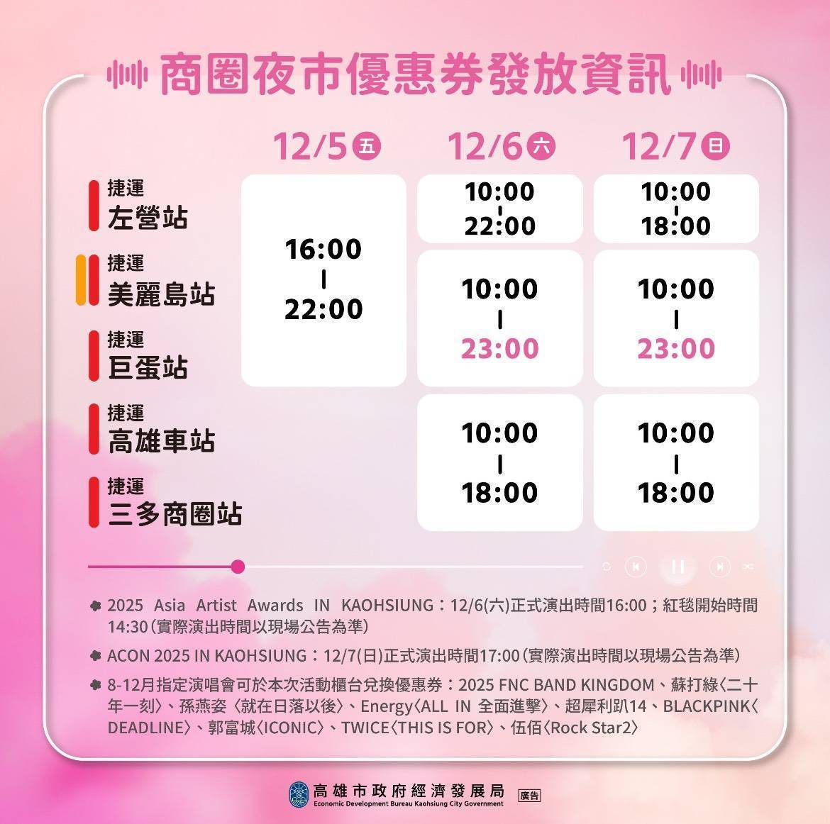 繼兩大韓國大勢女團BLACKPINK、TWICE於10月、11月高雄開唱,本週末(12月6日)韓國指標性娛樂盛典「Asia Artist Awards(AAA亞洲明星盛典)」典禮首次移師台灣舉辦,適逢典禮十週年,將集結IVE、Stray Kids、LE SSERAFIM、IU、朴寶劍等共22組華麗卡司,並於隔日(12月7日)還有「ACON音樂節」,由女團i-dle台灣成員舒華擔任主持人,兩日盛大K-pop活動,將再次炒熱高雄世運主場館。為熱烈歡迎遠道而來的歌迷們,高雄市政府配合大型音樂活動,推出面額50元的商圈夜市優惠券,粉絲憑演唱會門票到指定5處捷運站(左營、巨蛋、美麗島、三多商圈及高雄車站)即可馬上兌換,並前往高雄40+處商圈夜市及超過400+家的特色店家消費使用,在高雄一次體驗追星與美食的雙重魅力。