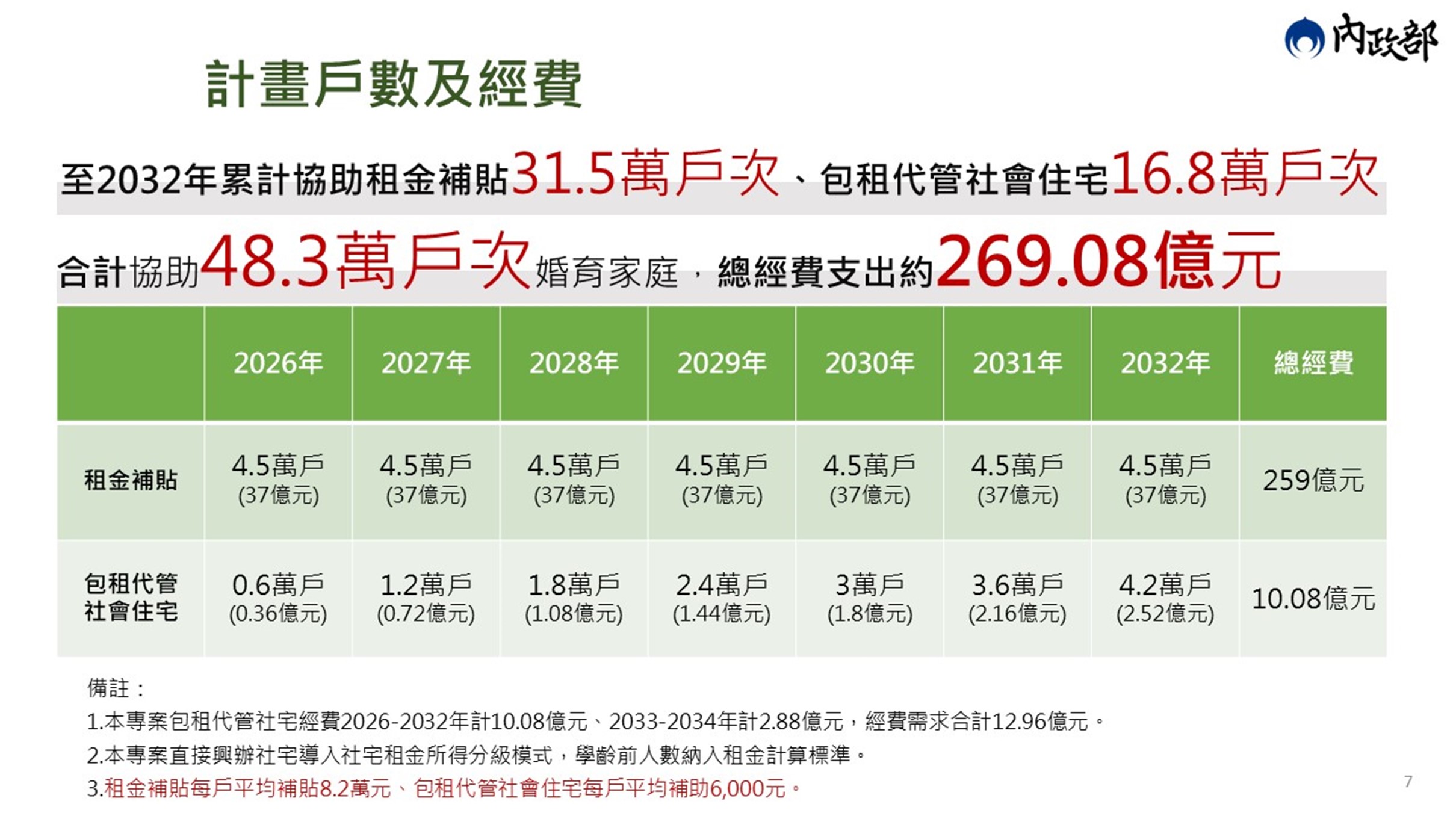 內政部表示,「青年婚育租屋協助專案」將原300億元中央擴大租金補貼專案計畫規定所得標準,由每人每月平均所得從最低生活費3倍放寬至3.5倍,符合資格者依現行300億元中央擴大租金補貼加碼制度辦理。另登記結婚或育有新生兒的家庭將再擴大加碼,自登記結婚2年內加碼補貼50%,每多生1胎再加碼補貼50%,只要民眾敢婚、敢生,政府一定全力給予支持。
