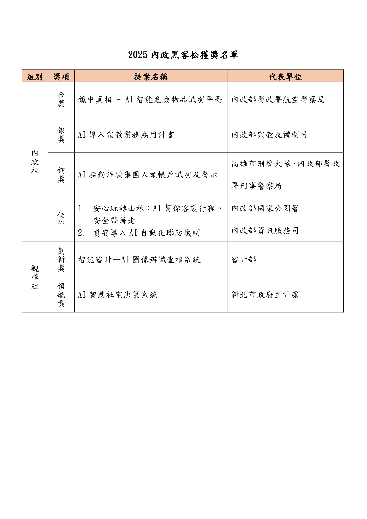 內政部補充,為促進並提升內政資料應用深度,今年活動另增設觀摩組,邀集審計部及各級主計機構參與。其中,審計部的「智能審計—AI圖像辨識查核系統」利用電信信令、AI分析街景圖與地址識別碼,自動識別疑似逃漏稅的營業場所,榮獲「創新獎」;新北市政府主計處則以「AI智慧社宅決策系統」獲得「領航獎」,該系統整合人口、地理圖資等多維度數據,協助社宅需求預測與選址,提升資源配置效益,兩組團隊各獲獎金1萬5仟元。