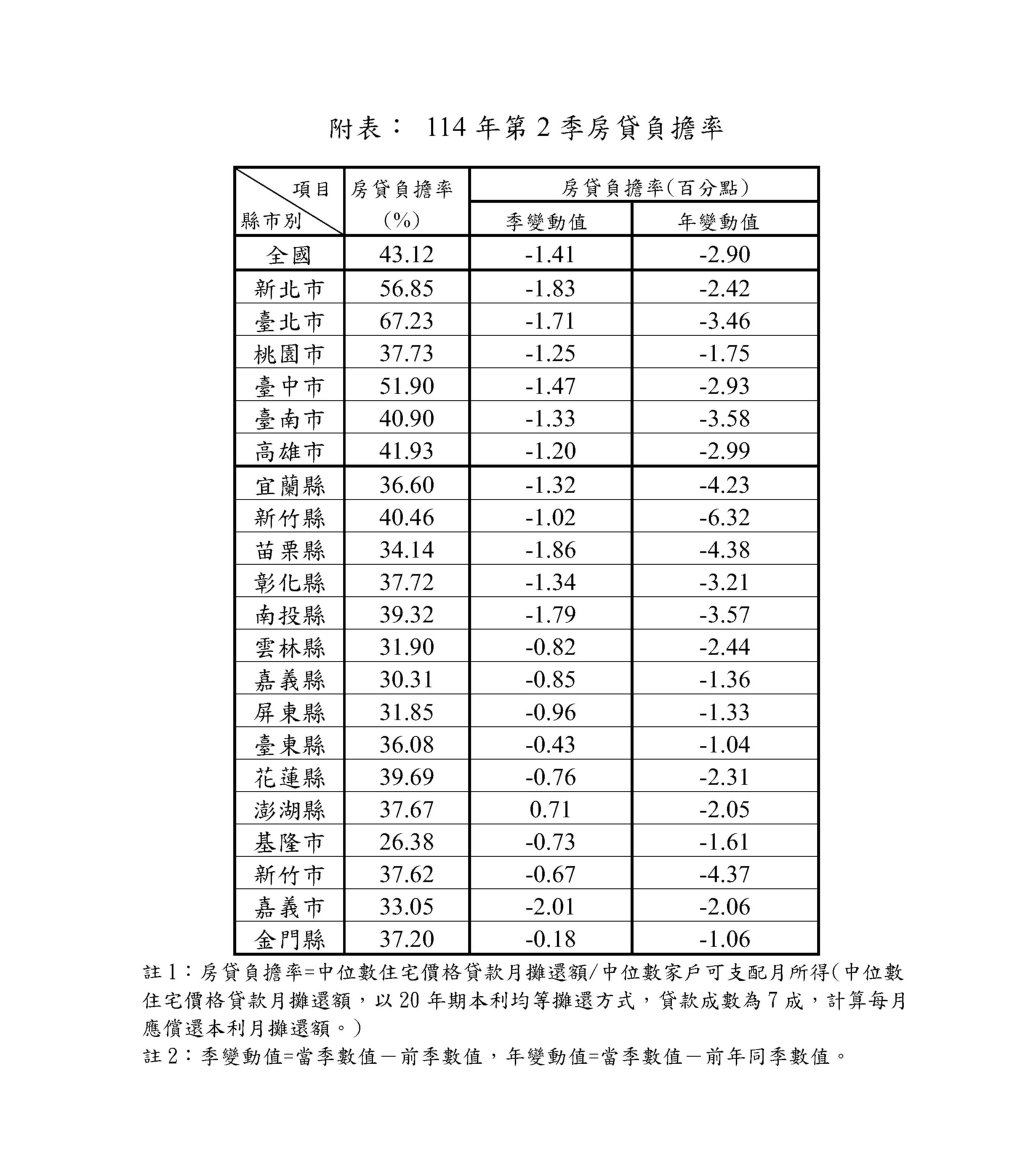 內政部今(28)日發布114年第2季全國房貸負擔率為43.12%,較上季下降1.41%。內政部表示,受央行持續實施選擇性信用管制等因素影響,中位數住宅價格已連續2季下跌,加上家戶可支配所得持續增加,使房貸負擔率自去年第3季高點以來,連續3季出現下降。