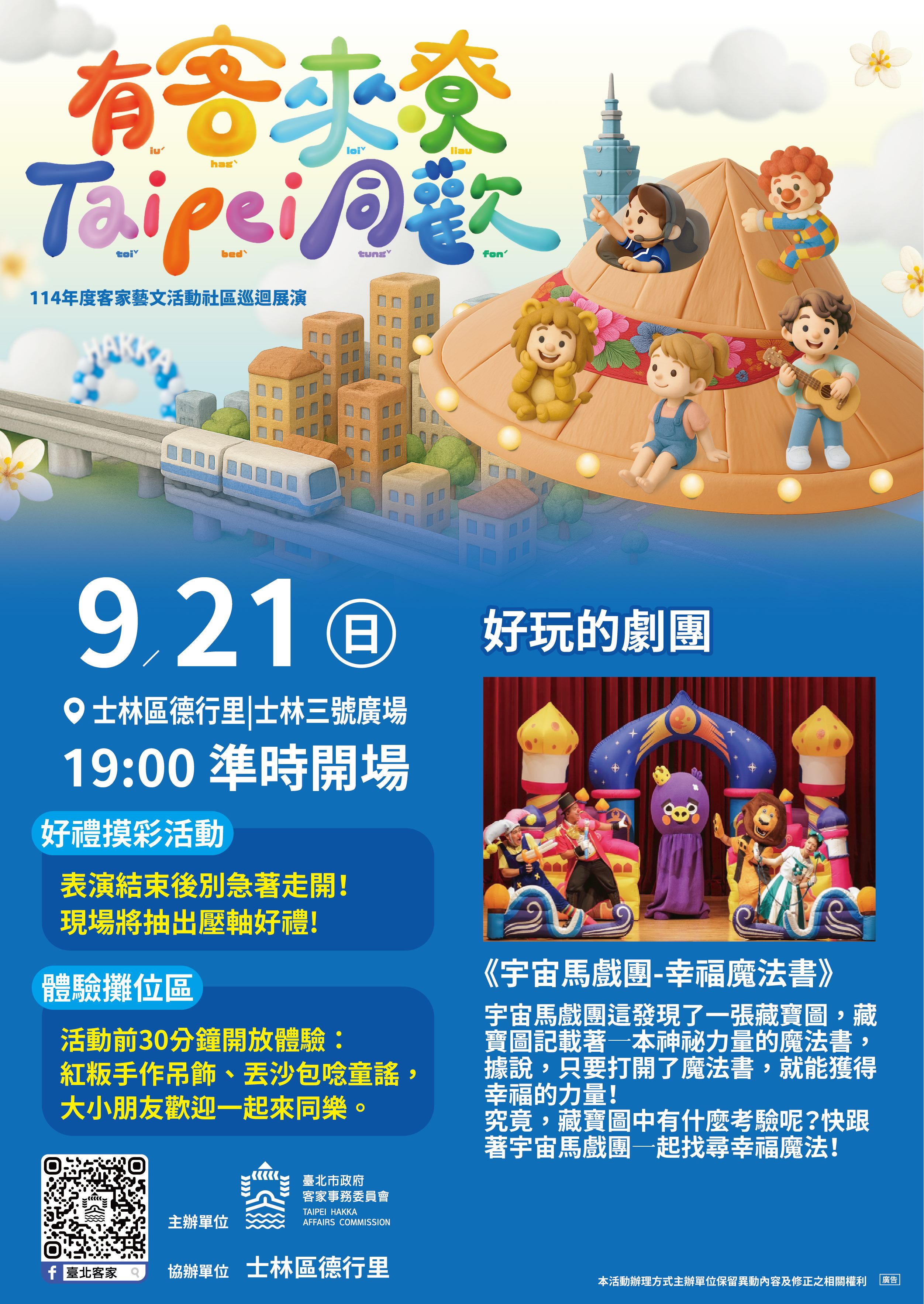 九月的臺北即將成為一座流動的藝術樂園!由采風樂坊、銀河谷音劇團、鞋子兒童實驗劇團、龍潭愛樂管弦樂團、好玩的劇團以及奇岩室內樂團六大團隊攜手合作,推出一系列充滿創意與文化底蘊的親子藝術活動。活動將深入臺北六大行政區,於大同、大安、中正、萬華、士林與文山區接力登場,邀請民眾攜家帶眷一同走入充滿文藝氣息與歡樂氛圍的藝術世界。