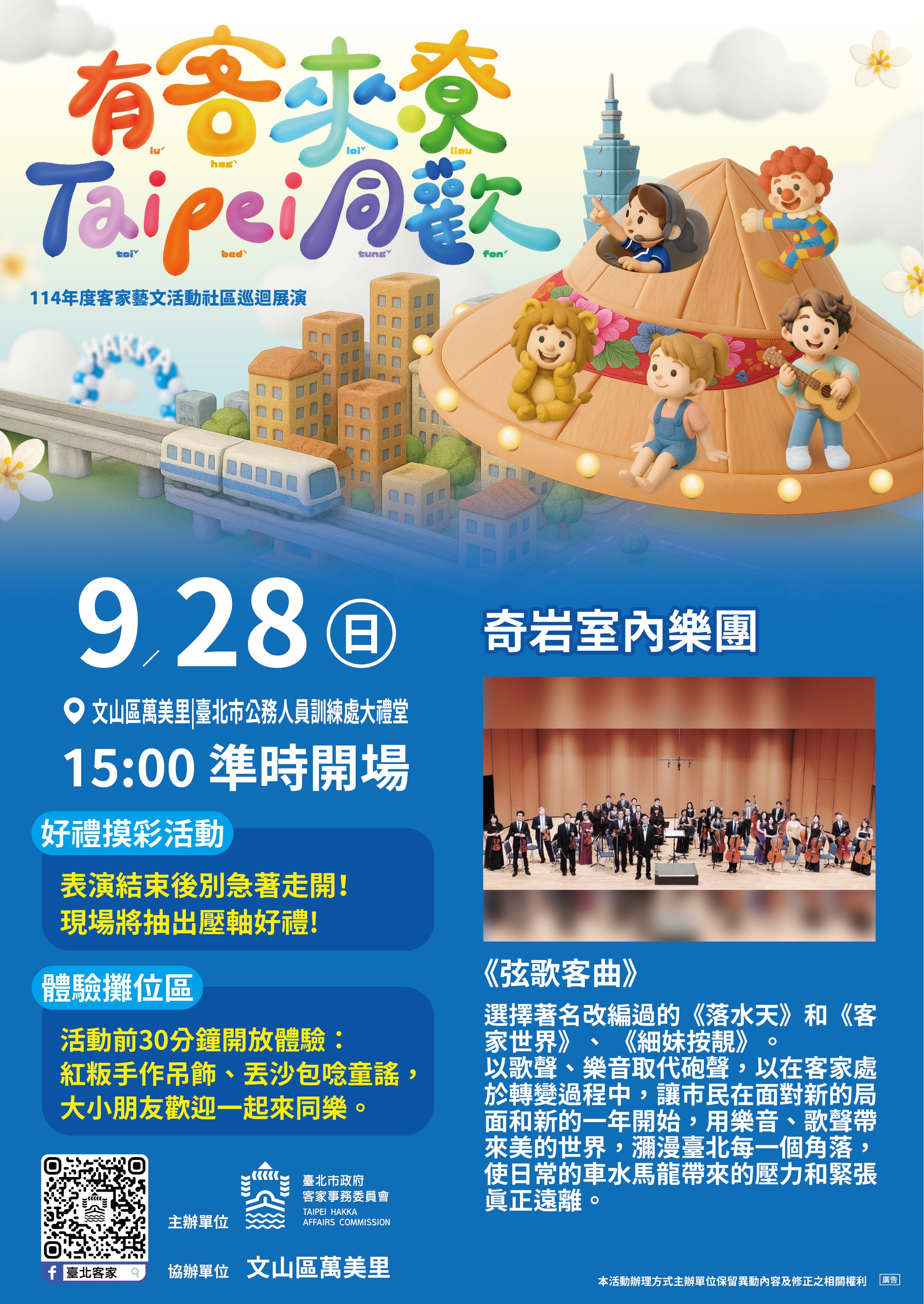 壓軸演出由奇岩室內樂團《弦歌客曲》,以深情演奏與動人歌聲,呈現溫暖音樂饗宴,讓文山區化為音樂的桃花源,為2025客家藝文活動社區巡演劃下完美句點。