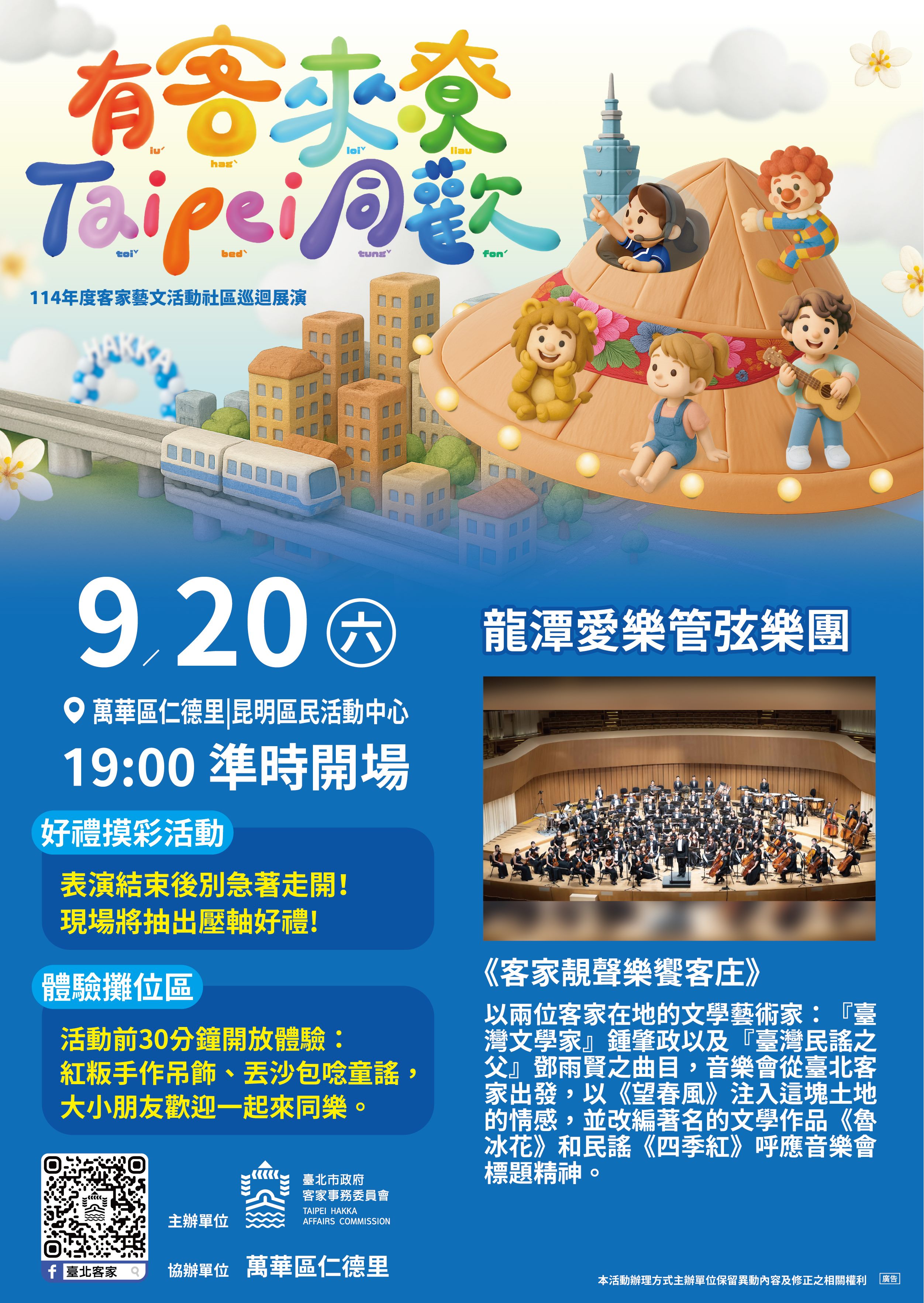 除了精彩的節目以外,現場提供客家紅粄吊飾體驗、品嚐客家美食及體驗客家唸謠丟沙包,更準備摸彩活動,讓參與民眾有機會把多項好禮帶回家,邀請大家一起同樂!詳細活動資訊可上本會官網 或臉書搜尋「臺北客家」粉絲團追蹤最新消息及動態。