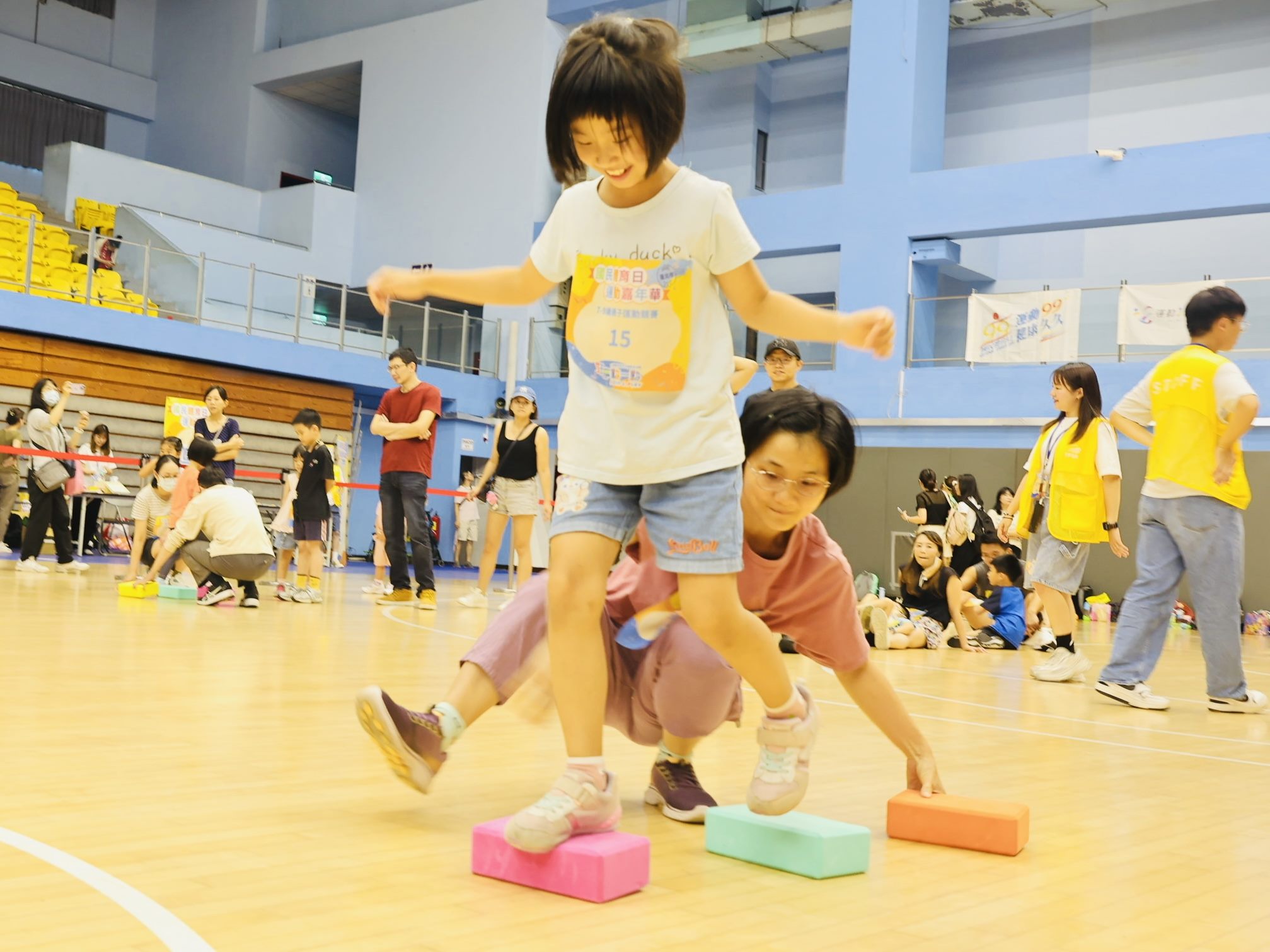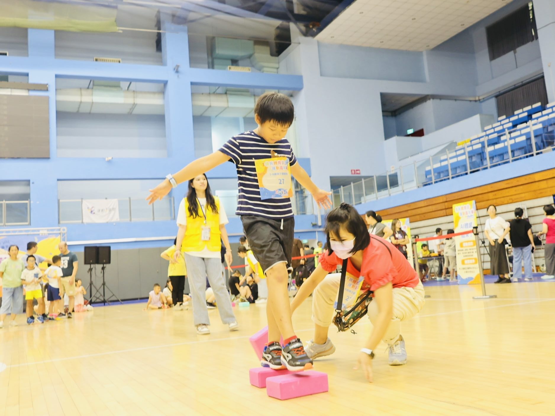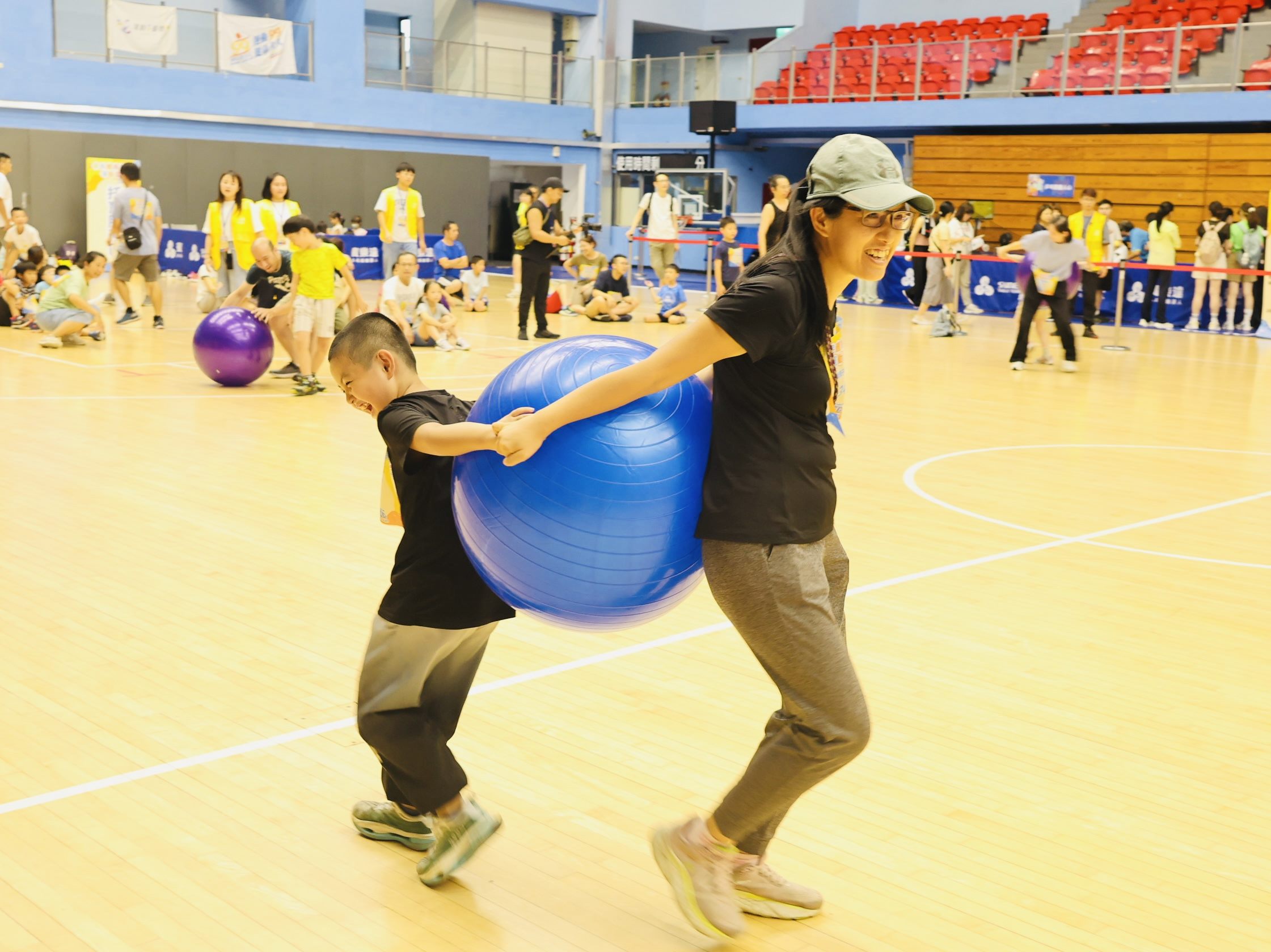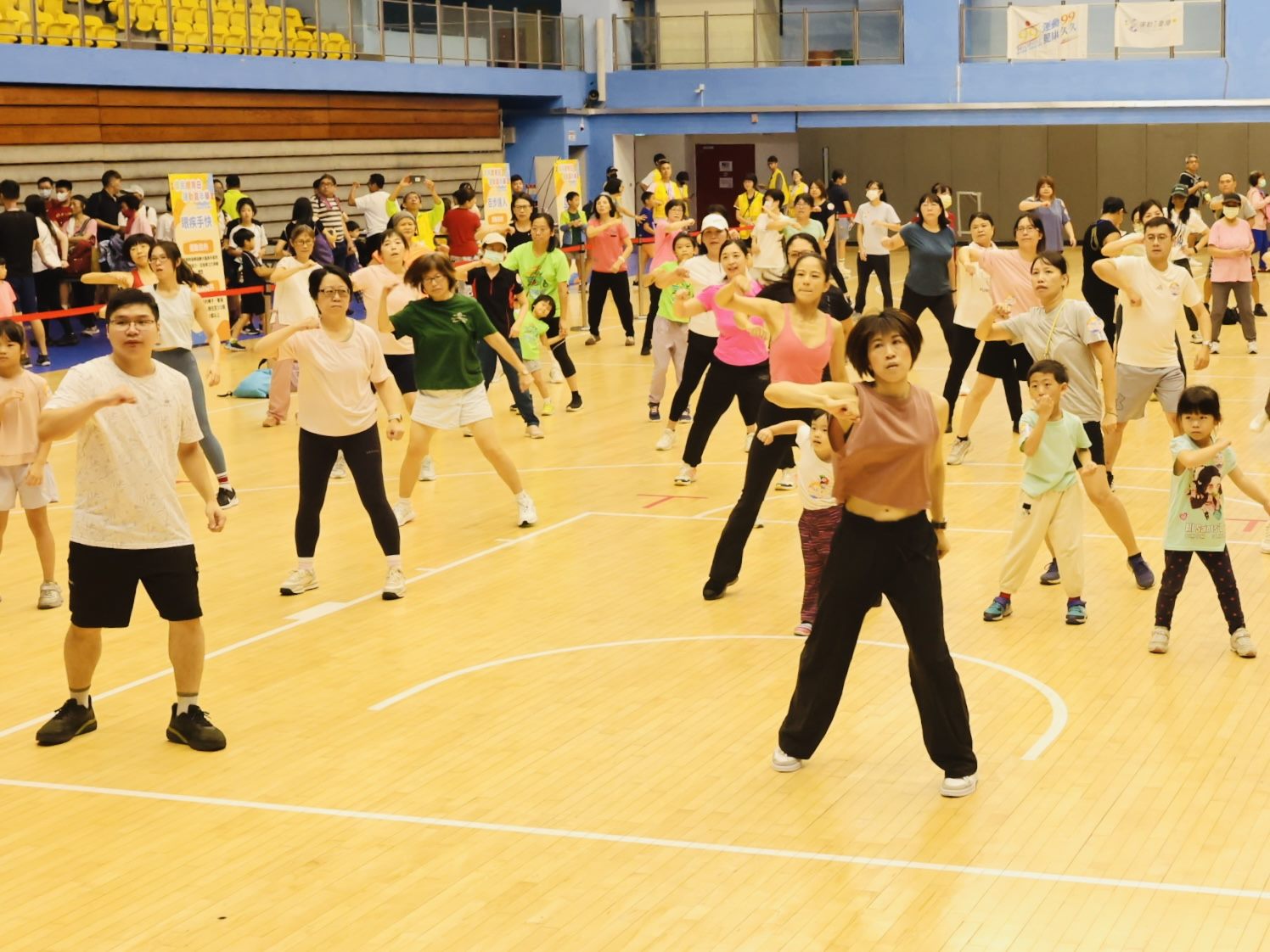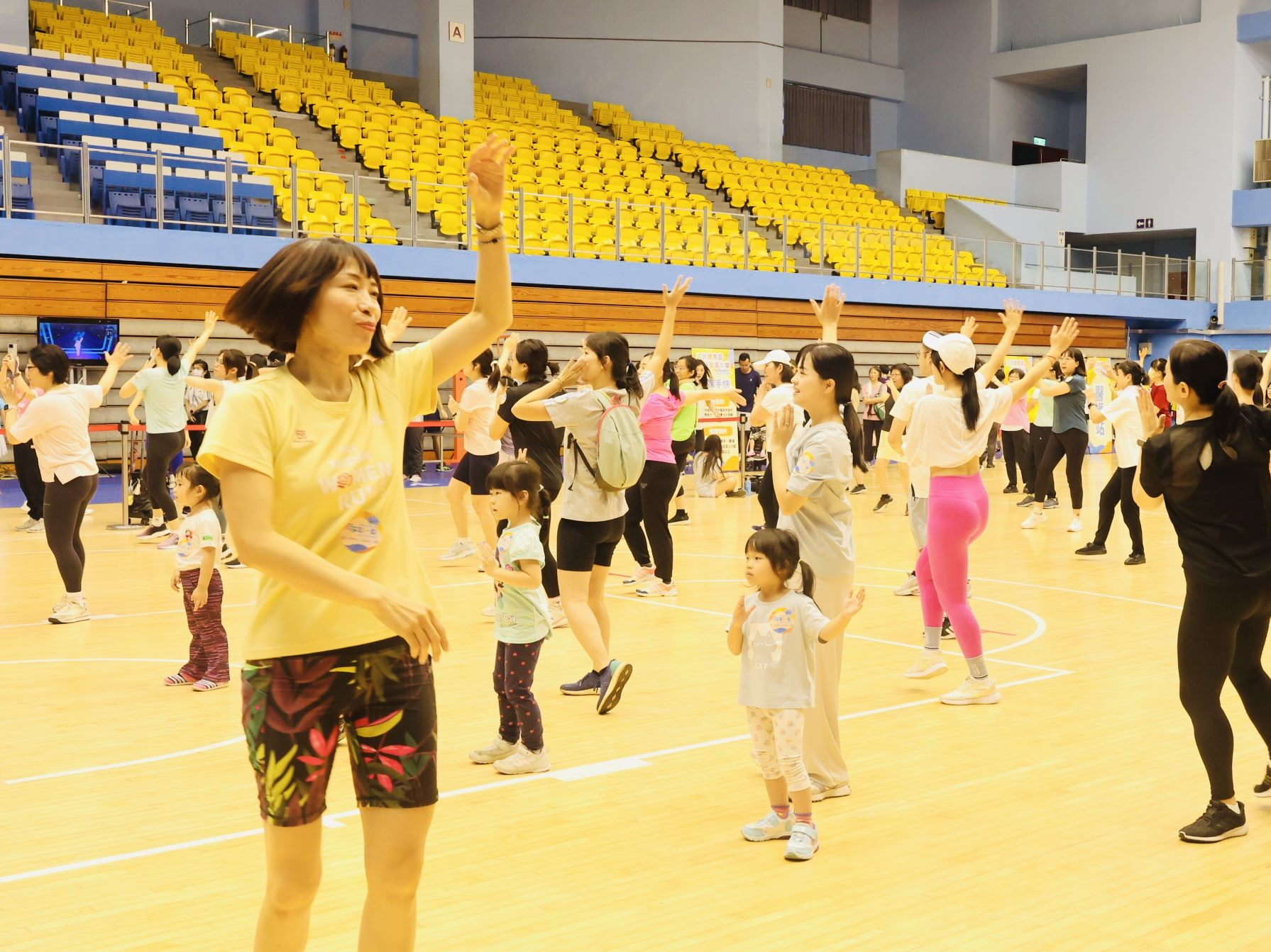 上午首先登場的是「愛動有氧大進擊」,由專業有氧老師帶領,融合音樂、舞蹈與親子律動,打造宛如演唱會般的舞台派對,全家大小都能跟著節奏盡情揮灑汗水。下午則舉辦「親子運動競賽」,依年齡分為3–6歲與7–9歲組,設計跳躍前行、同心協力、套圈接力、地上有岩漿等遊戲,強調親子合作與互動,現場氣氛熱烈。許多小朋友在挑戰中展現勇氣,孩子不僅玩得開心,還學到彼此合作的重要性!活動另提供貼心服務,設置臨時托育區,聘請專業保母協助照顧小小孩,讓家長帶著小孩參加活動時也能放心托育。此外,體適能專區安排專業檢測人員現場向民眾解說個人身體組成分析及提供運動指導建議,全場活動都是免費參加。