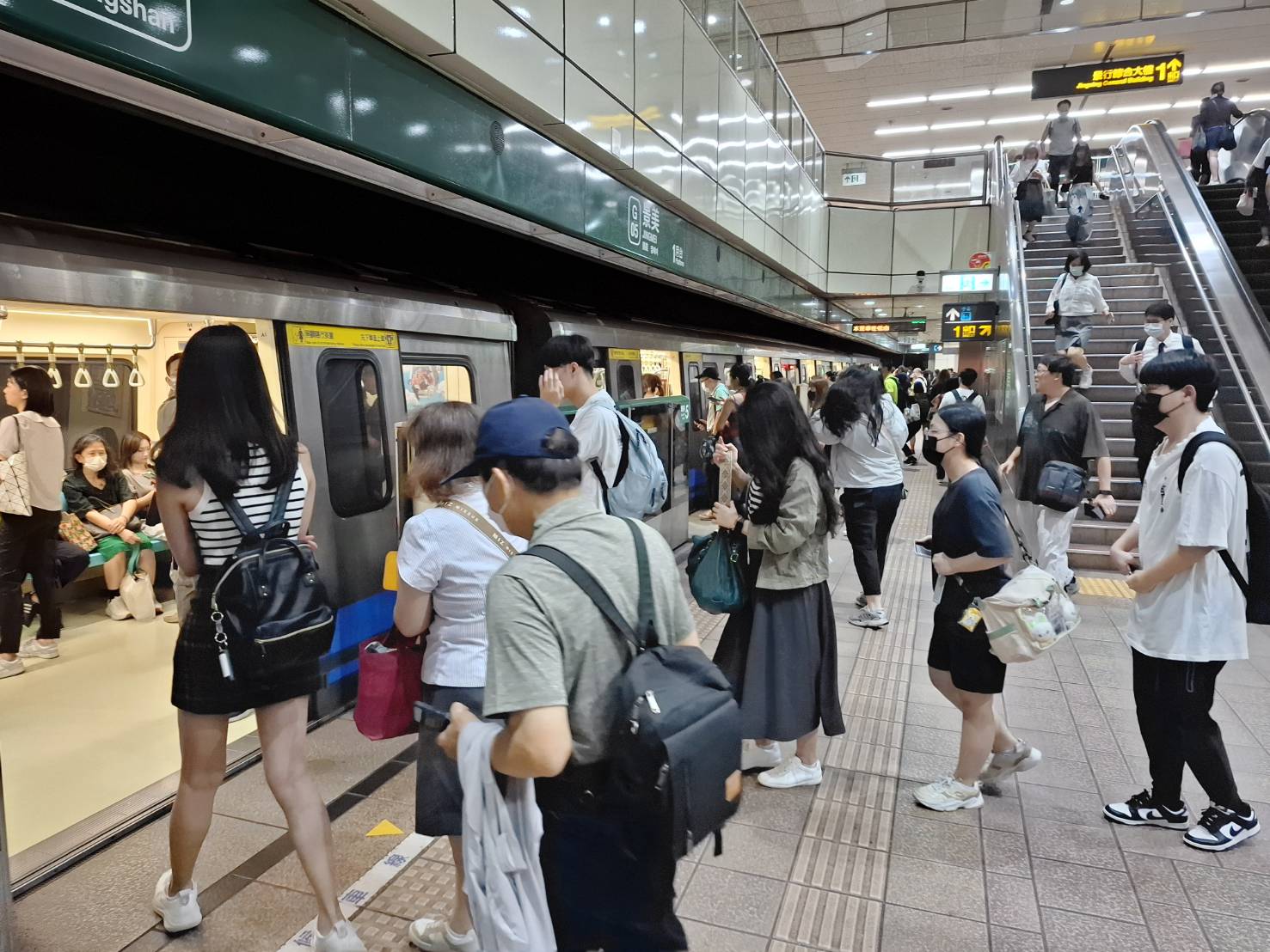 15日為優惠措施實施後上班上課首日,臺北捷運加派服務人員著黃色背心、手持指揮棒,引導旅客上下車,疏運順暢。