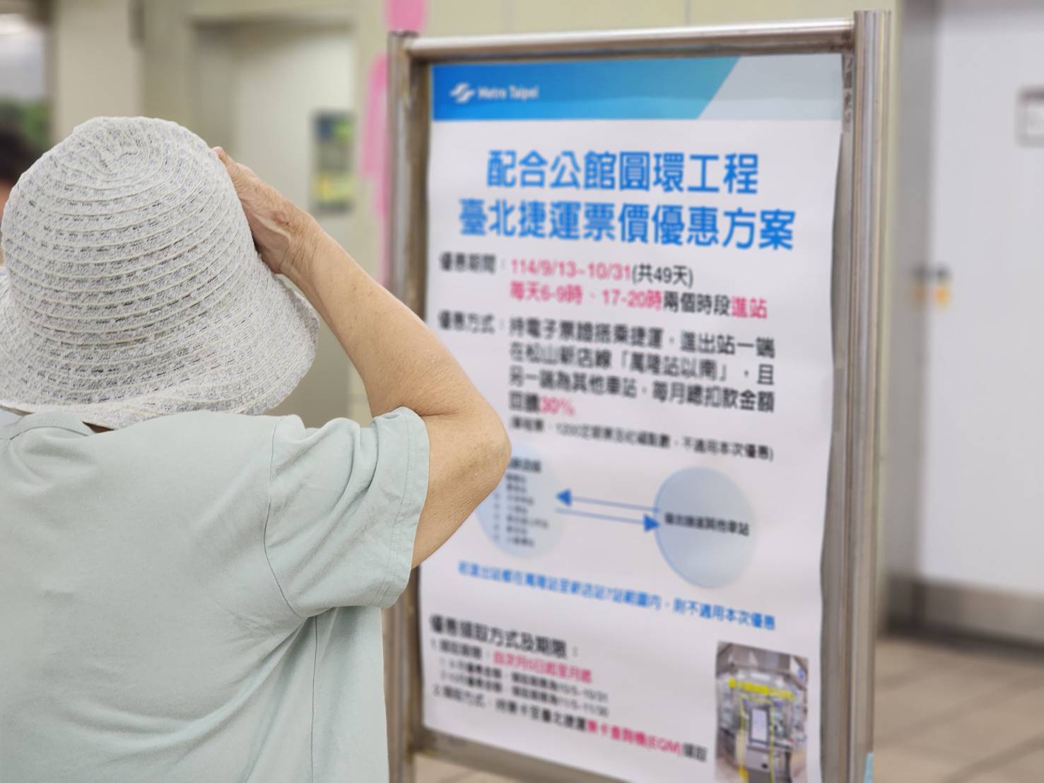 臺北捷運公司配合臺北市政府公館圓環工程,9月13日至10月31日推出捷運優惠措施。今(15)日為上班上課首日,統計上午6時至9時進入捷運車站,且進出站一端為萬隆站以南等7站之運量約為4萬6千人次,較九月份同日型增加約1100多人次,其中享回饋30%金額約有1萬7千人次,整體疏運狀況良好。