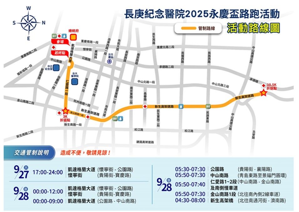 長庚紀念醫院及中華民國路跑協會訂於114年9月28日(星期日),假本市凱達格蘭大道等道路辦理「長庚紀念醫院2025永慶盃路跑活動」,為維護交通秩序與活動安全,臺北市政府警察局將實施交通管制,禁止車輛通行,管制路段及時間如下:一、9月27日12時至17時:管制凱達格蘭大道(懷寧街至公園路)東西向外側各3線車道;另於17時至24時管制全線車道。二、9月27日17時至24時:管制懷寧街(貴陽街至寶慶路)全線車道。三、9月28日管制路段及時間:(一)凱達格蘭大道(懷寧街至公園路):0時至12時管制全線車道;12時至15時管制西往東外側3線車道。(二)凱達格蘭大道(公園路至中山南路):0時至9時管制全線車道。(三)懷寧街(貴陽街至寶慶路):0時至12時管制全線車道。(四)公園路(貴陽街至襄陽路):5時30分至7時30分管制全線車道。(五)中山南路(景福門圓環路段):5時50分至7時30分管制北往南車道。另南往北車流,管制於景福門右轉信義路直行。(六)仁愛路(中山南路至金山南路):5時50分至7時40分管制中央4線車道(含公車專用道);6時至6時40分管制南側慢車道。(七)金山南路(新生高架至仁愛路):5時50分至7時30分管制北往南內側2線車道。(八)新生高架道路(通河街至濟南路):4時30分至8時管制北往南各入(出)口匝道。 活動期間,請用路人避開交通管制路段,提前改道行駛,規劃改道動線如下:一、「凱達格蘭大道東西向車流」請改道行駛貴陽街或愛國西路。二、「仁愛路東往西方向車流」請改道行駛愛國東路或忠孝東路。三、「欲穿越仁愛路及景福門圓環之南、北向車流」請改道行駛金山南路(南往北)、重慶南路。四、「原新生高架道車流」請改道行駛新生北路、中山北路。 活動期間賽道沿線實施交通管制,禁止車輛通行,管制範圍內之公車候車處暫停服務,民眾如欲查詢公車改道路線,請利用臺北市公共運輸處網站http://www.pto.gov.taipei/查詢相關資訊。 為維護本市道路交通安全與順暢及減少用路人因交通管制造成之不便,該局籲請用路人留意收聽警察廣播電臺路況插播,並遵守各路口執勤員警及義交人員指揮、疏導,共同維護交通安全與秩序。