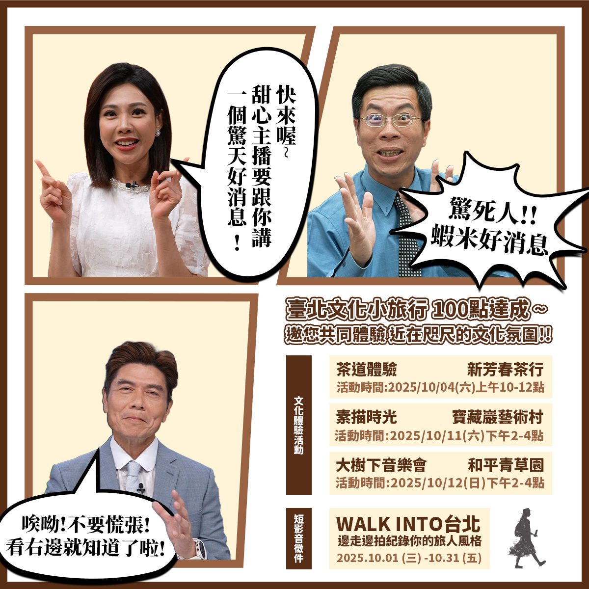 文化局表示,本次徵件不僅是一場活動,更是自己與城市的深層對話,期待每一位創作者都能成為走故事的人,用影像走進臺北,也走進自己的心,甜心主播潘照文、體育主播常富寧及臺語老師何信翰,邀請喜愛紀錄日常的你/妳,以臺北文化小旅行文化點為主題,透過30至60秒的短影音創作方式,用獨特視角捕捉臺北日常中的故事,創意展現城市的多元樣貌,也讓民眾深入造訪理解每處文化點不為人知與精采的樣貌,更多臺北文化小旅行請關注臺北文化小旅行官網、臺北文化小旅行google地圖包或設計臺北粉絲專頁。