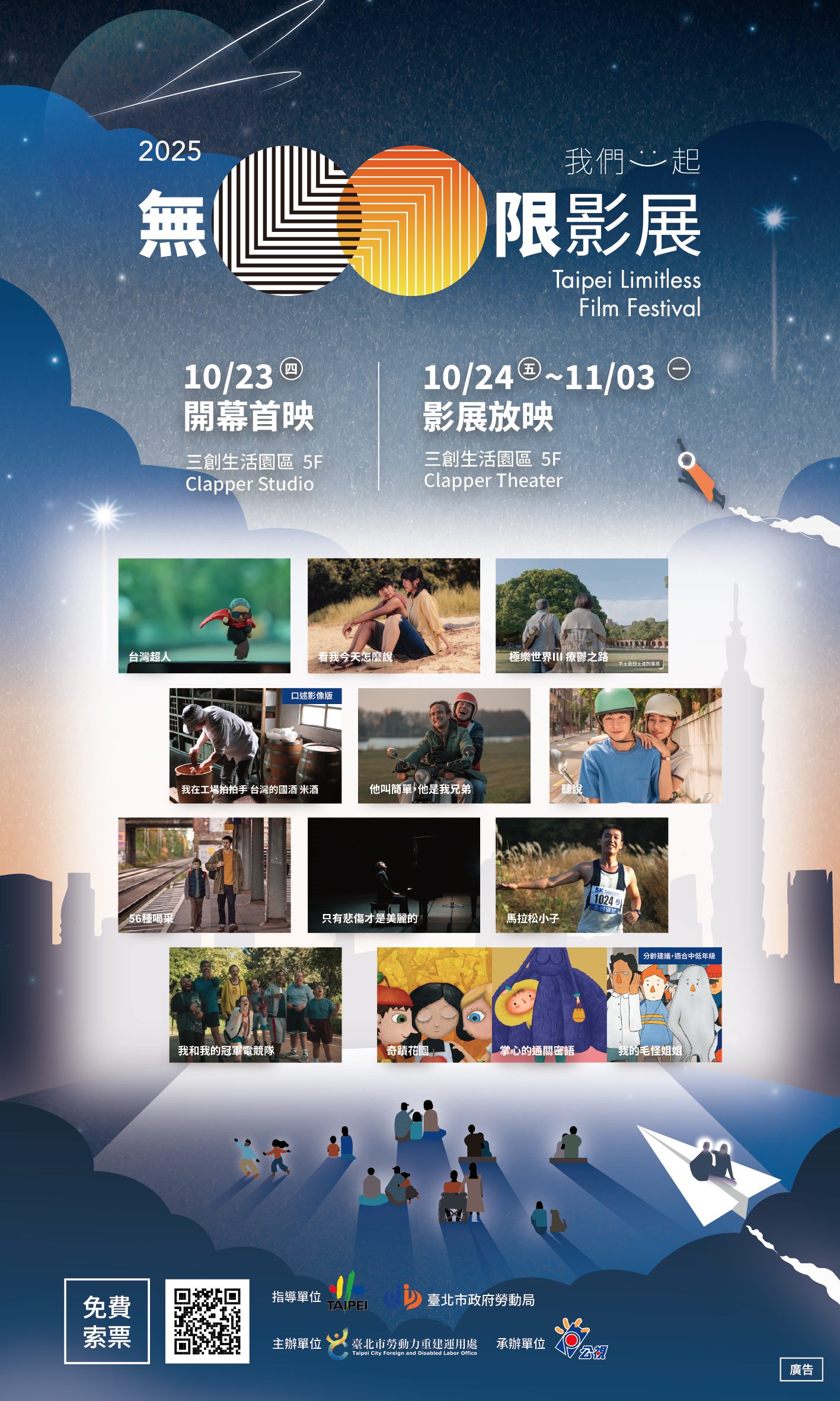 今年也特別規劃口述影像版本的《我在工場拍拍手》,以及以過 動症、視障、憂鬱症為主題的《兒童短片合集》,首次結合親子放映, 讓大小觀眾在觀影中不僅體驗多元生命的力量,更能理解「無障礙」 如何成為教育、就業與社會參與的重要基礎。這些影片不僅是故事, 更是一場場真實的對話,邀請大家透過電影感受差異,進而學會擁 抱不同。 《2025無限影展》自10月9日(四)起開放免費索票,索票方式及 活動詳情請上影展官網或票券平台。