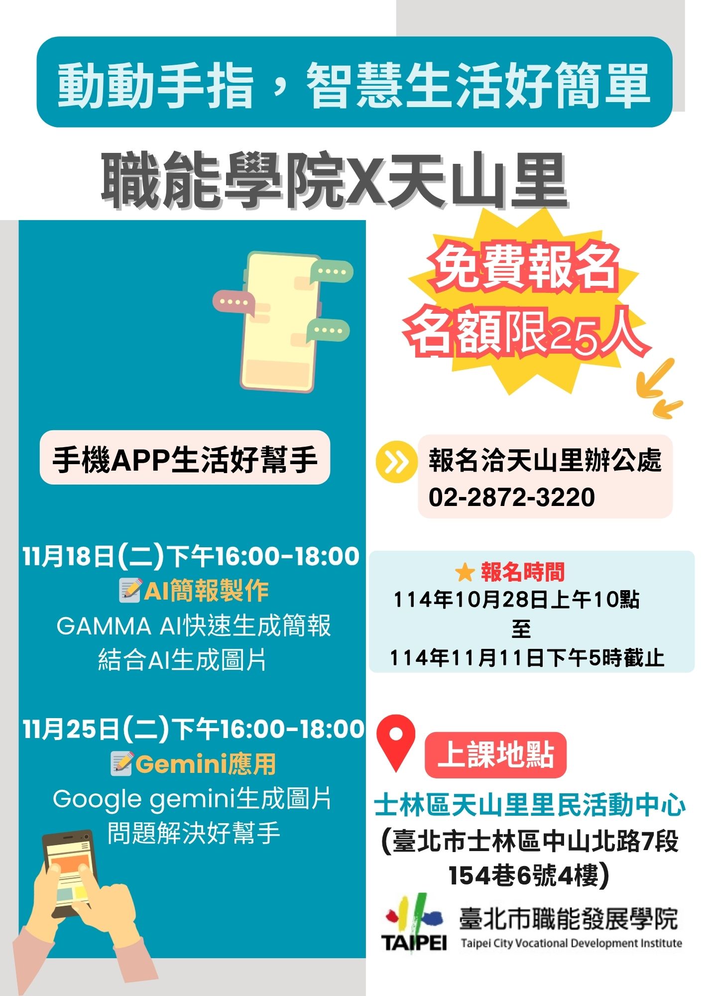 課程預計於114年11月18日及25日開課,報名期間自114年10月28日至11月11日止,凡對手機應用與數位生活有興趣的民眾皆可向當地里辦公室報名參加。