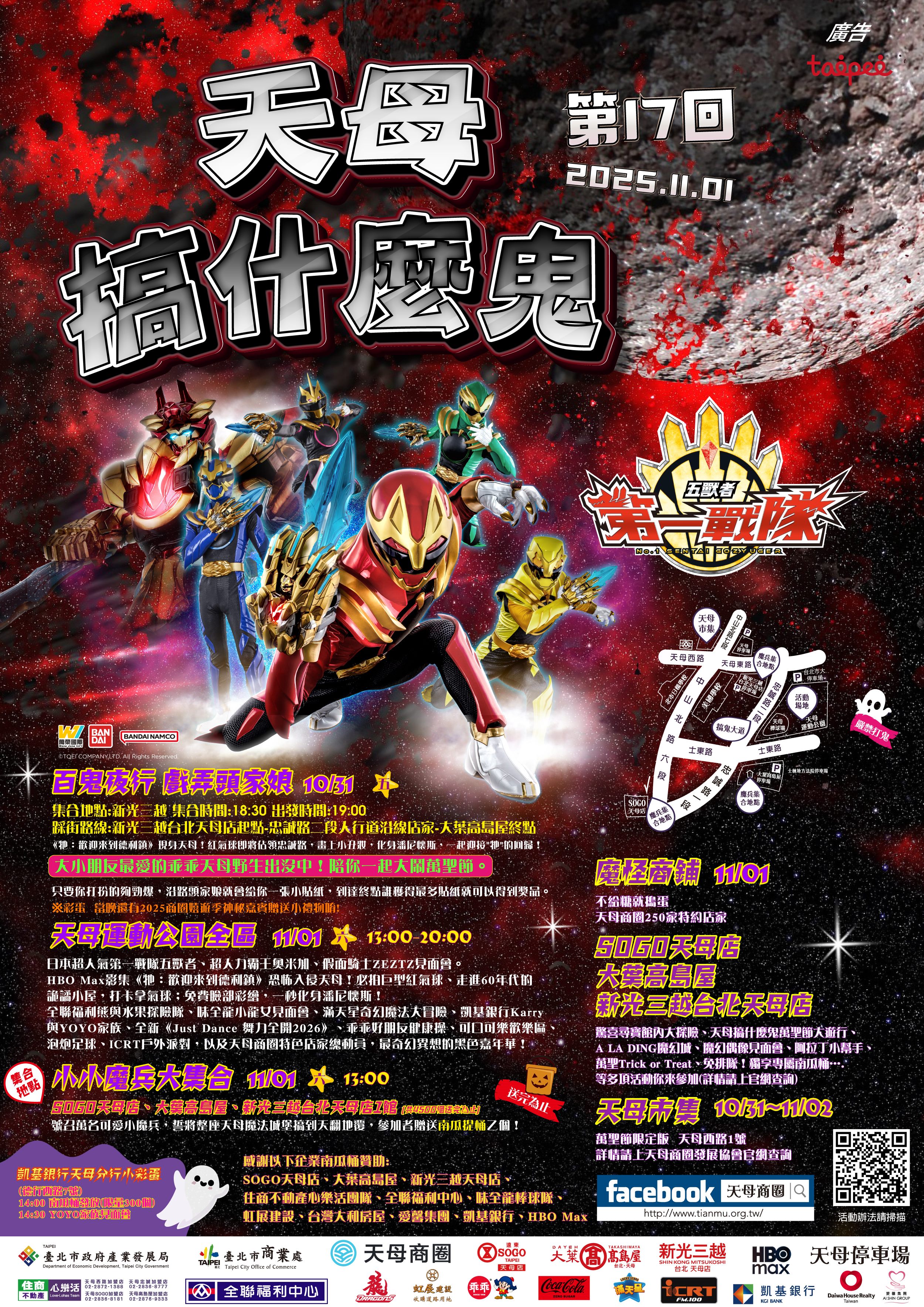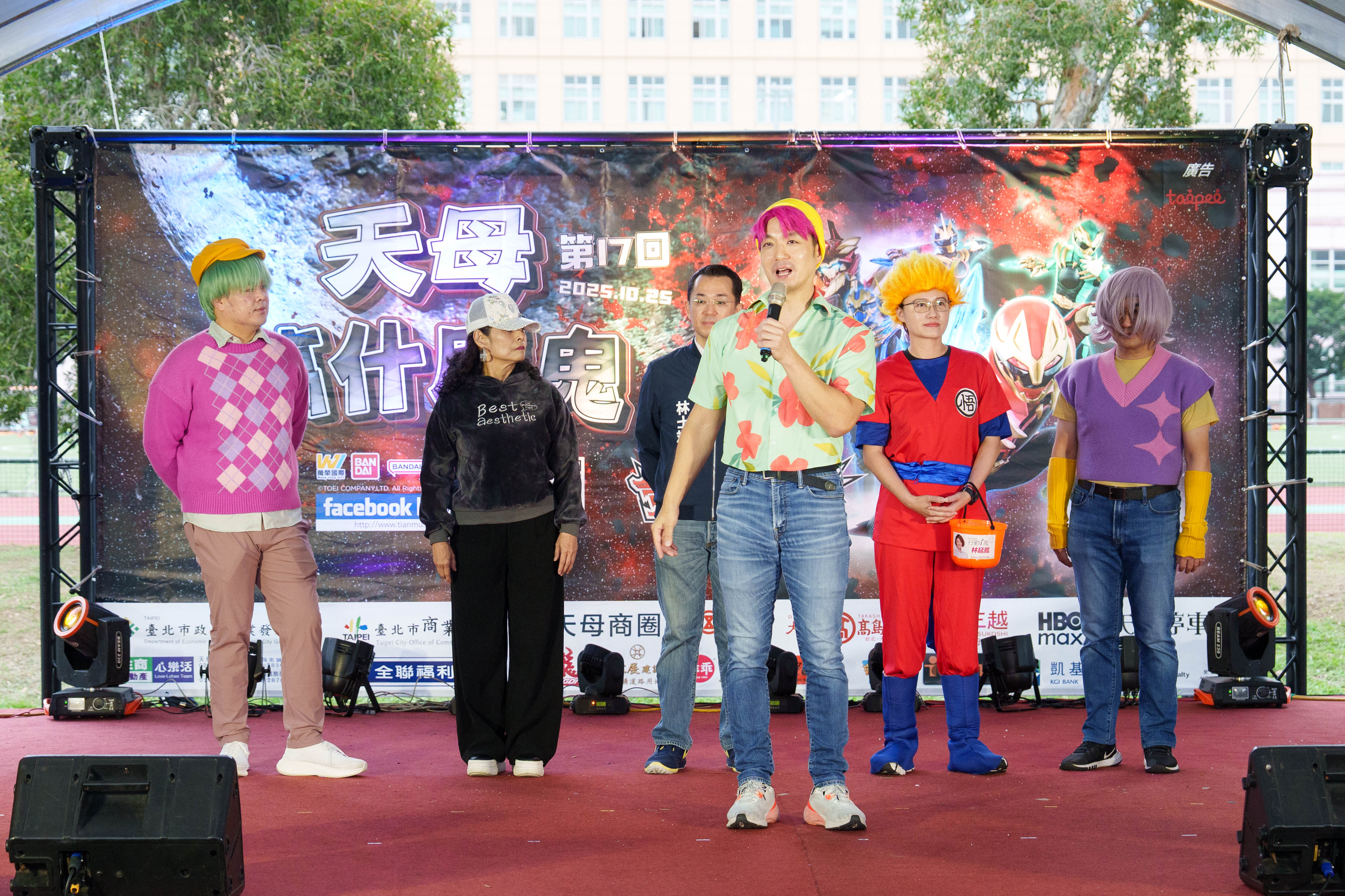 由臺北市商業處輔導台北市天母商圈發展協會辦理的天母搞什麼鬼17萬聖節嘉年華活動現場人潮爆滿、氣氛熱烈,大小朋友變裝互動、逛市集拿好禮,盡情投入這場全民搞鬼的節慶派對。今年更首度攜手HBO Max合作,打造原創影集《牠:歡迎來到德利鎮》沉浸式恐怖展區,重現60年代詭譎小鎮風格,巨型紅氣球與潘尼懷斯本尊驚喜現身,成為最吸睛的打卡熱點。更集結「第一戰隊五獸者」、「超人力霸王奧米加」、「假面騎士ZEZTZ」、「乖乖」及「Dragon Beauties」等現場互動等人氣角色,趣味十足的「滿天星奇幻魔法大冒險」、「萬聖節泡泡擂台挑戰賽」等活動與貝丹秘密市集,聯手炒熱天母萬聖週末,全齡嗨玩、熱鬧爆棚!