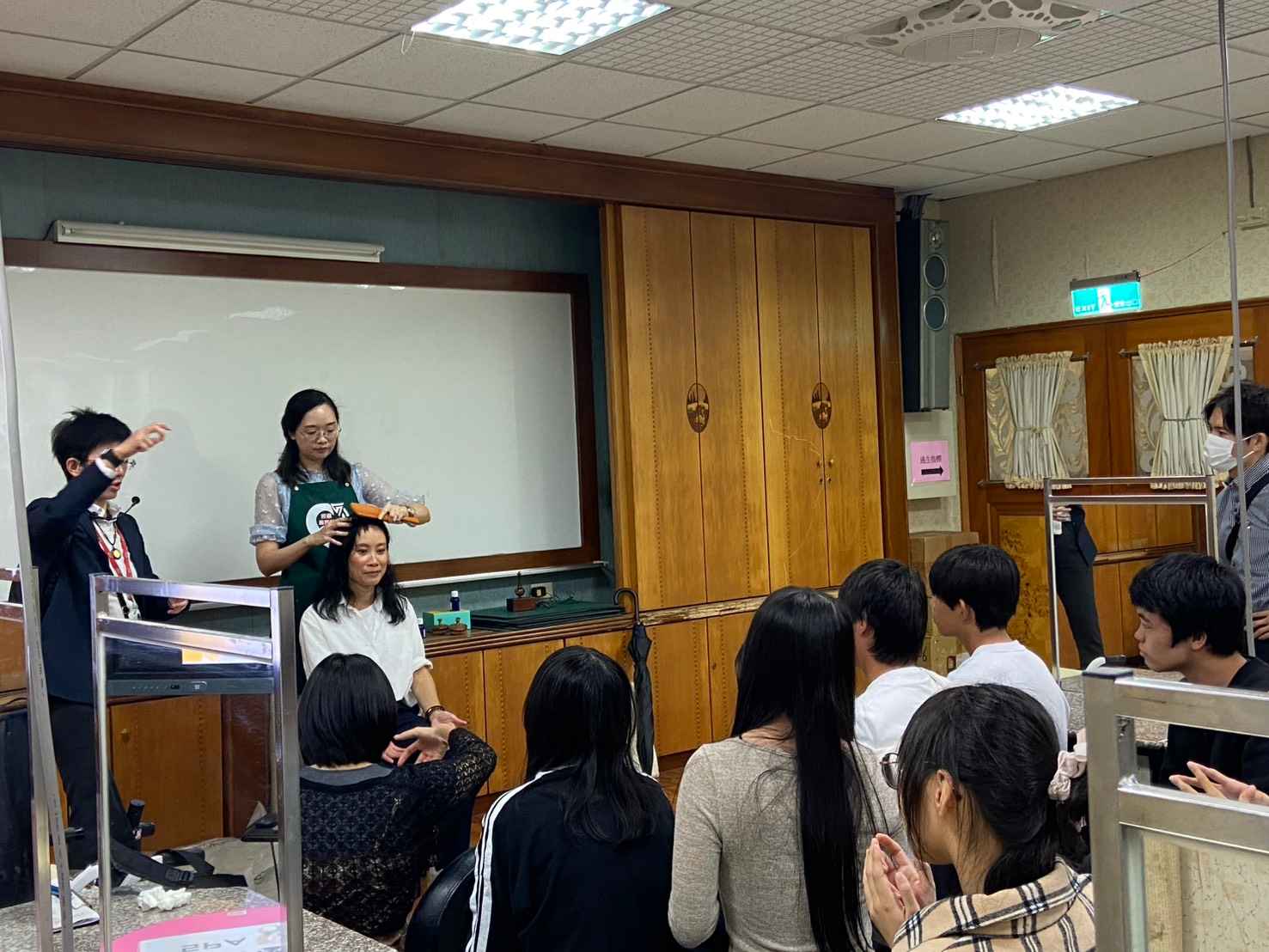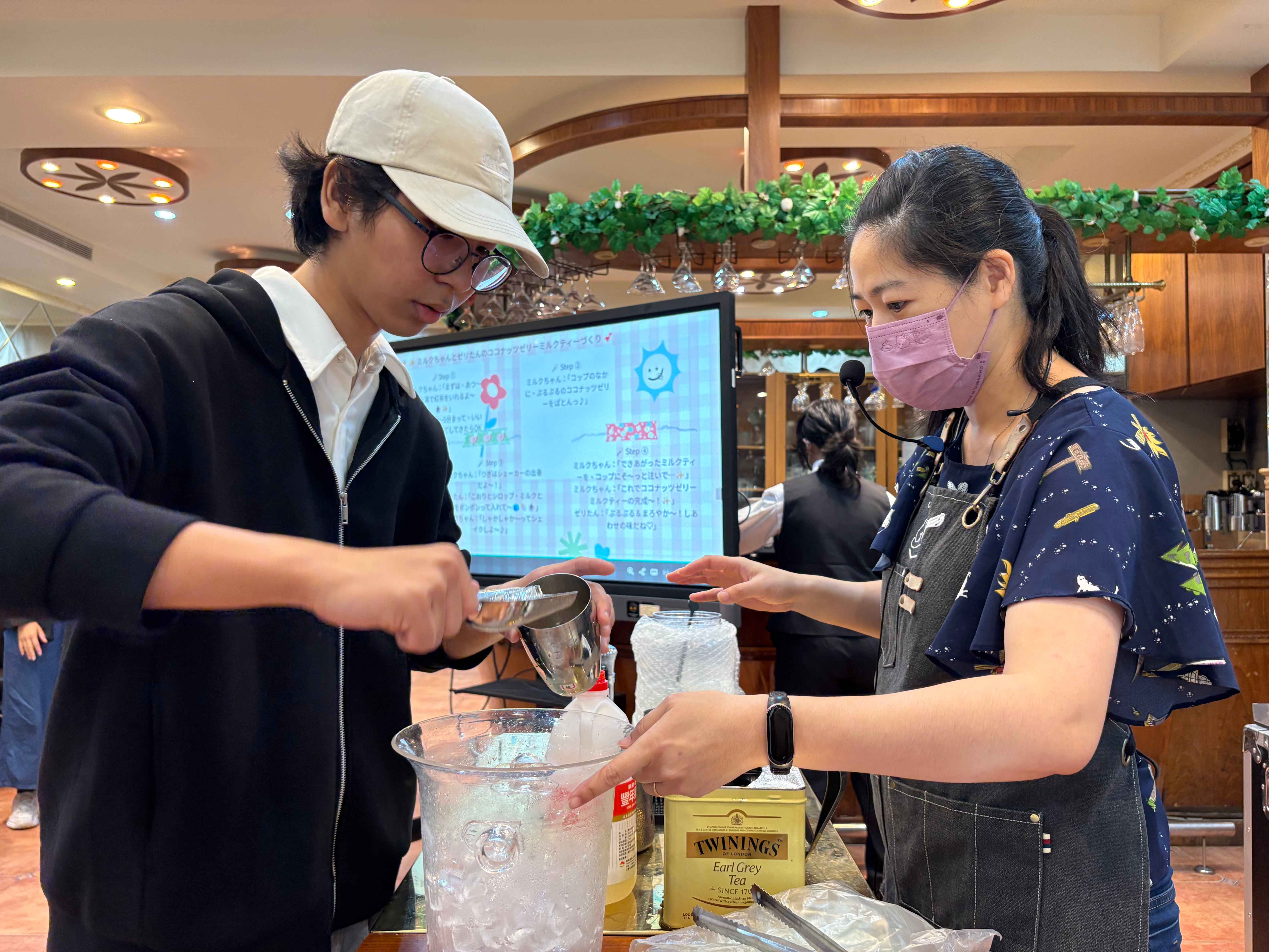 日方高校學生最期待的技職體驗由觀光事業科「喬治航空」與「創意飲調」;時尚造型科「頭皮紓壓」與「萌寵扭扭」;照顧服務科的「小小照服員」5組課程。喬治航空之空姐空少機艙服務「Tea or Coffee」依然有模有樣啊、創意飲調「椰果奶茶」清涼透著椰子香甜,好喝呢!「頭皮紓壓」從嗅吸精油與頭皮按摩梳沿著頭皮滑按著,瞬間頭到肩頸已紓壓解壓啊!又是一陣扭阿扭、轉又轉、推推推、捏一捏,超神奇一隻可愛寵物狗活靈活現啊..樂齡樂活健康照護,「小小照服員」體驗著檢測「生命徵象」,悉心呵護模樣,同樣專業100分!
