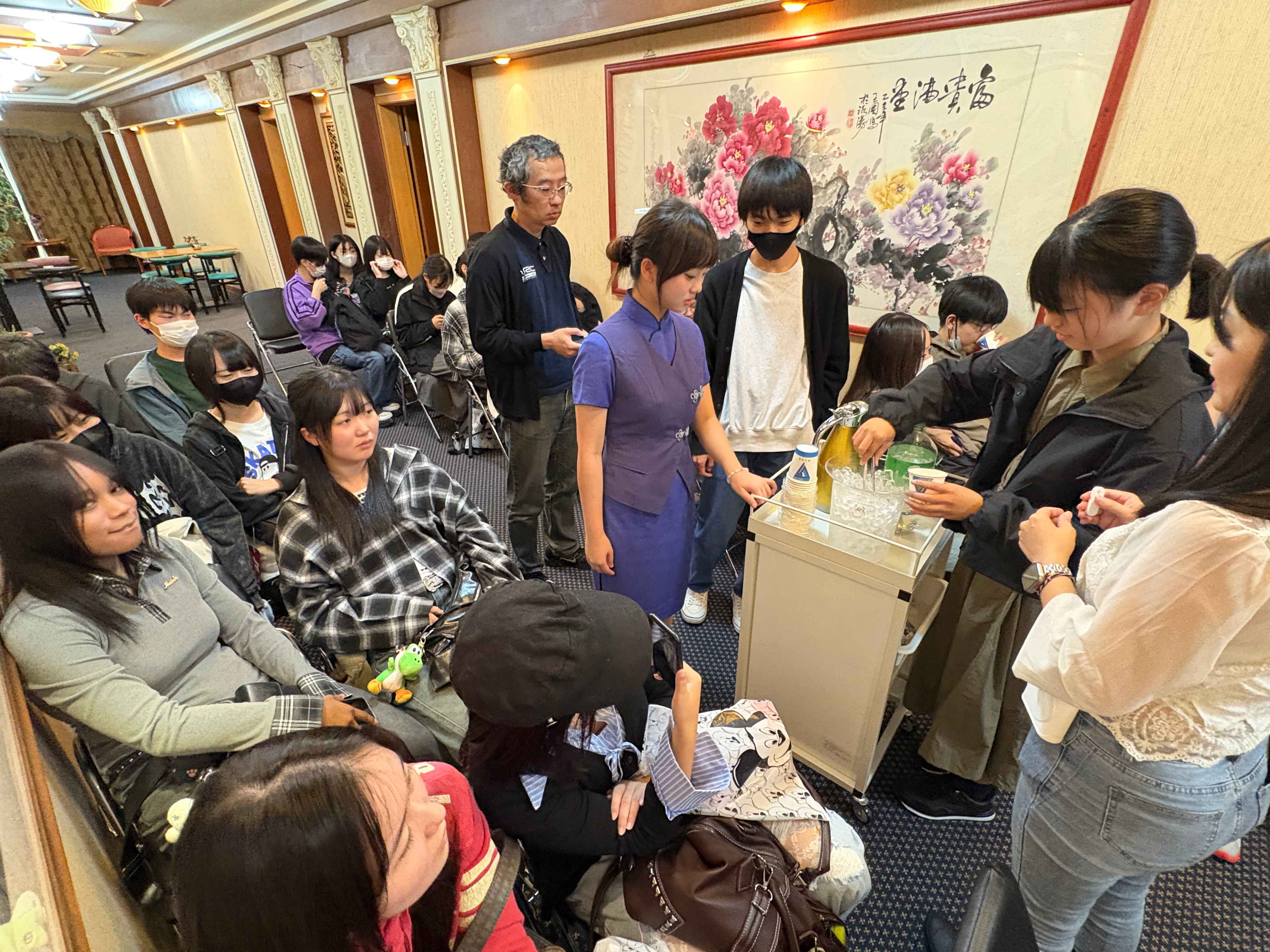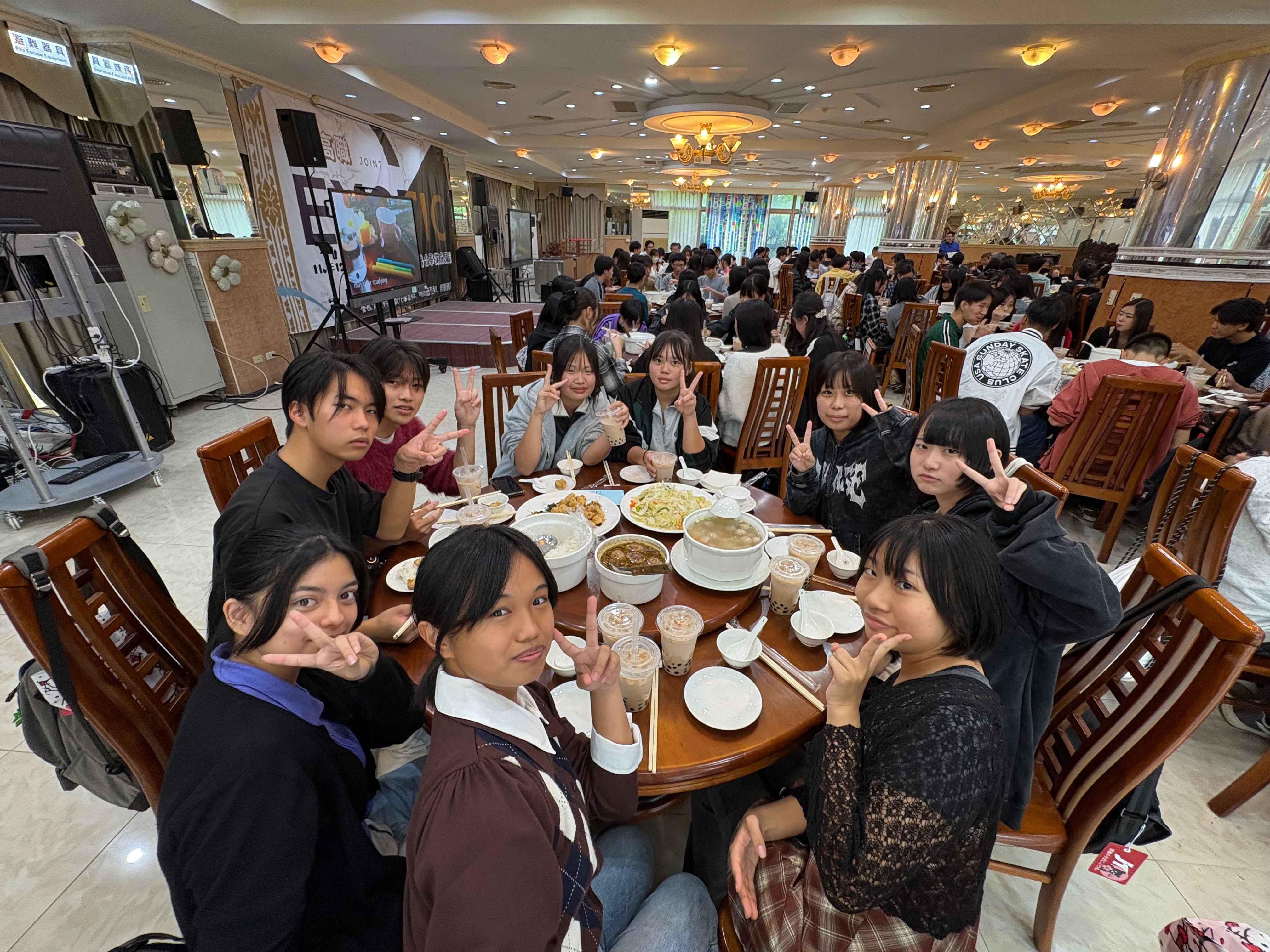 香味撲鼻、陣陣臺灣滷肉飯香已啟動肚子飢餓開關,紛紛洗手就定位在豪華的霞雲廳,犬山総合高校校長一句「開動」,滷肉飯、鹹酥雞、清炒高麗菜、滷蛋等經典臺灣古早味,從張張滿足的臉龐,洋溢著幸福美味與滿足。餐飲管理科楊仁杰主廚、林鴻安老師及一群手藝精湛的喬治小廚師們,也因為一掃而空的桌面,成就感爆棚。犬山総合高校師生們即使肚子鼓鼓,但永遠有一個空間等待著享受甜點,卡滋卡滋杏仁脆片,完美!最後那一杯世界聞名的「臺灣珍珠奶茶」,沿著吸管吸、喝;咬、吞,快樂到最高點….