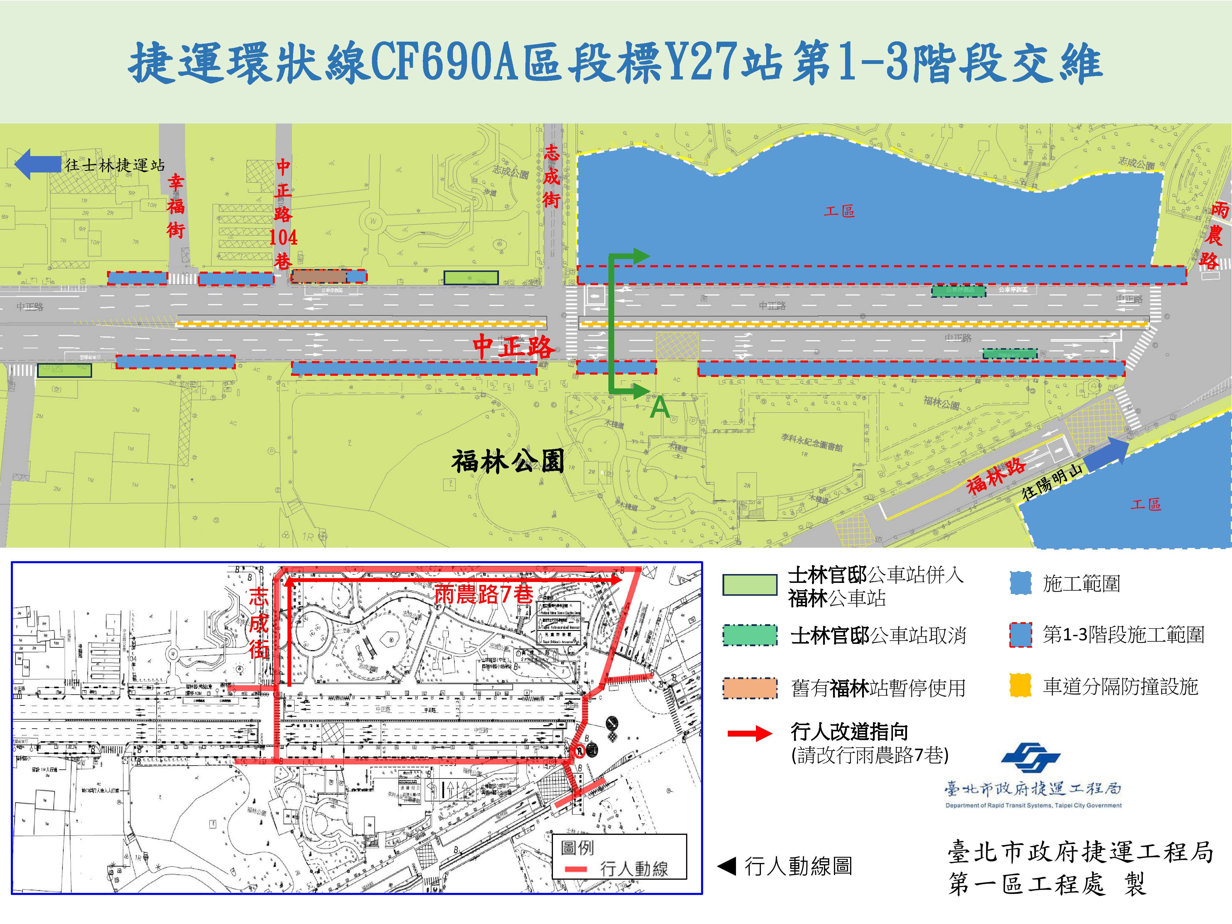 為配合捷運環狀線北環段CF690A區段標工程Y27站第1-3階段交維作業,捷運工程局第一區工程處將於114年11月6日至114年12月30日(每日上午8時至下午8時)進行士林區中正路區域性交維(中正路120號至福林路),遇雨順延,相關施工範圍如附圖。 本階段交維圍設進行Y27站第1-3階段人行道削減及公車亭移設作業,本階段工程施作期程自114年11月6日起至114年12月30日止,施工期間原有車道數不變(中正路120號至福林路間維持雙向各3車道),原志成公園前人行道因削減及公車亭移設施工,人行動線改行志成公園內步道或雨農路7巷(銜接至雨農路)替代,施工作業期間請用路人行經施工區域減速慢行,並請依改道後之宣導牌面、導引標誌及現場指揮人員導引指示減速慢行,以確保行車安全,民眾如有任何問題以及建議事項,或想瞭解最新施工動態,可隨時利用下列聯絡電話反映,將有專人竭誠為您服務與解說,施工造成暫時不便,敬請見諒。